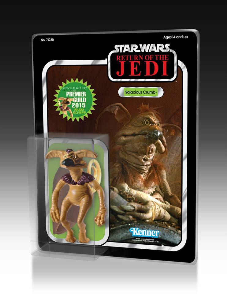Gentle Giant has revealed their 2015 Holiday Exclusive: a Salacious Crumb Jumbo Figure. Available for pre-order now from current Premier Guild Members, this larger recreation of the vintage Kenner original stands 7-inches tall and comes in a jumbo sized vintage packaging in collector friendly, re-sealable blister. Holiday 2015 bonus items include a knit fabric hat and scarf, fabric gift bag, C3PO head, and mini gift boxes.