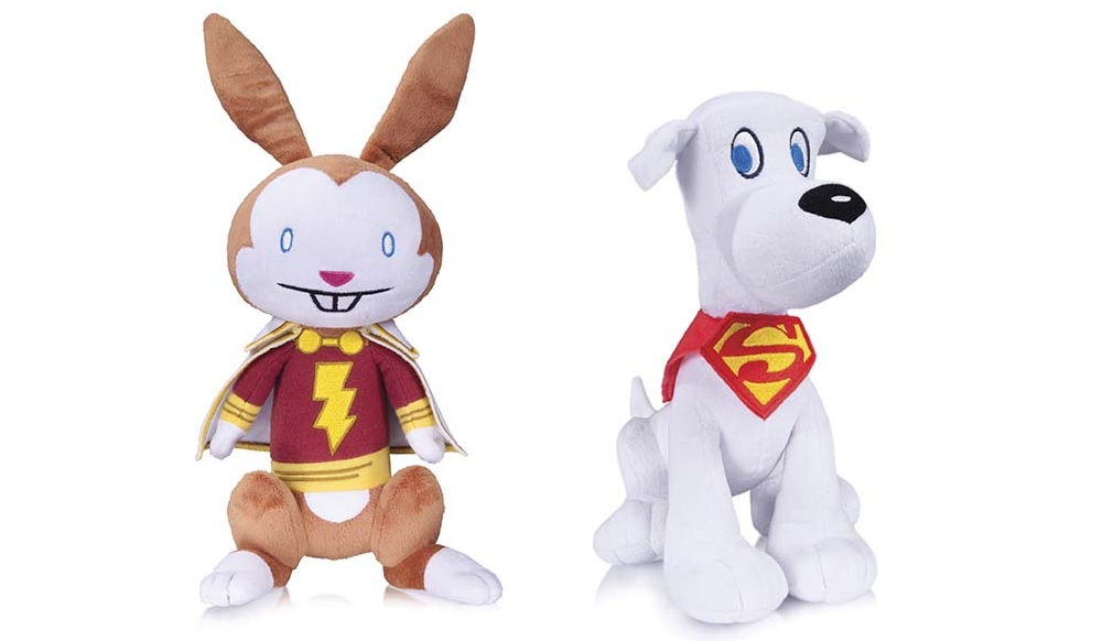 Two terrific new Super-Pets are here! These plush figures are sure to delight, whether you take home Krypto, the powerful pup from Krypton, or Hoppy, the cuddliest member of the Shazam family.