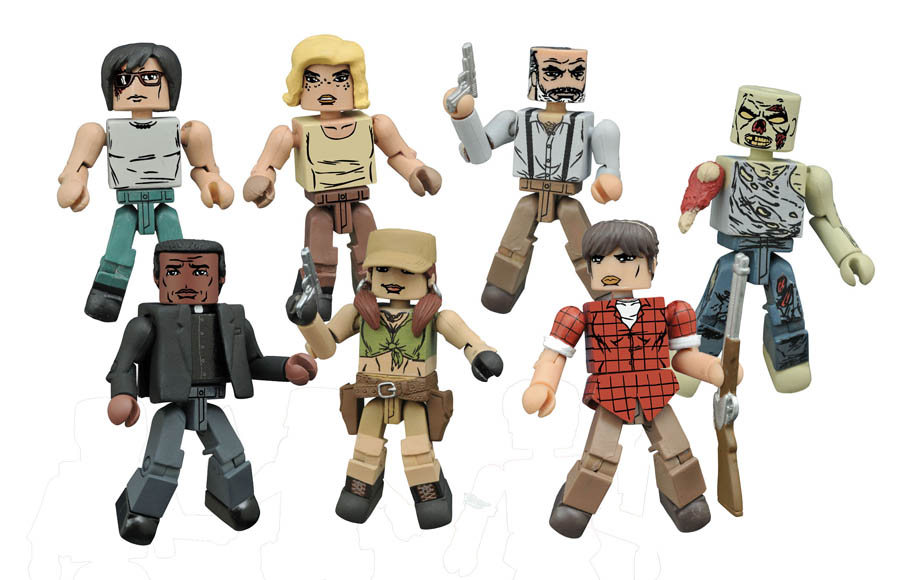 With the hit comic series expanding in new, shocking directions, and a new TV series on the air, there’s never been a better time to be a Walking Dead fan! This all-new assortment of comic-based Minimates mini-figures spans the time-jump, featuring “New Beginning”-era Carl with Sophia, “All-Out War”-era Rosita with Father Gabriel, Hilltop leader Gregory with a Forest Zombie, and a rare, one-per-case two-pack of new Hilltop leader Maggie Greene with a Forest Zombie! Each 2-inch Minimates mini-figure has 10-14 points of articulation and features fully interchangeable parts and accessories. Designed by Art Asylum! (Item #AUG152324, SRP: $9.99/ea.)