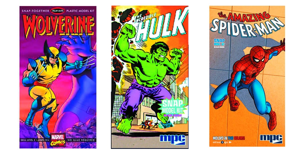 Assembling a model kit is now a snap! With these snap-together kits of Wolverine, Hulk and Spider-Man, you can assemble your favorite character with ease, then simply add paint! Wolverine stands atop a Sentinel head, is cast in yellow plastic with chrome claws, and has unmasked and masked head options! The Hulk is cast in both purple and green plastic, and has options for fists and open hands, so you can put different items in his hands to “throw” as he rampages on a rocky base! And Spider-Man is cast in both red and blue plastic, and can stand on a web base, or be hung on the wall! Hulk and Spidey are reproductions of classic 1979 kits! Each model is 1:8 scale, stands between 8 and 10 inches tall, and comes packaged in a full-color box with instructions.