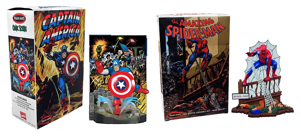 A Diamond Select Toys release! Character model kits have been the rage since the boom of the 1960s, and DST is proud to bring back two of the first-ever Marvel model kits, depicting Captain America and Spider-Man! Based on the 1966 Aurora originals, these new editions are enlarged to 1:8 scale, and stand over 8-10 inches tall. Spider-Man, webbing up Kraven the Hunter from a staircase, is cast in red plastic, with a clear web diorama piece. Captain America and his battlefield diorama are cast in blue, with clear water splash pieces. Both require glue and paint for assembly, and each can be placed in front of a full-color cardboard backdrop to complete the scene! Both kits come packaged in a full-color, vintage-style “Comic Scenes” box, with a mini-comic book that contains instructions and an exclusive comic story! Re-create a piece of pop-culture history with your own hands!