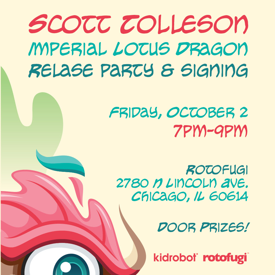 In celebration of the release, Scott Tolleson and Kidrobot will hold a release party signing at Rotofugi in Chicago, IL. The Imperial Lotus Dragon will be available for purchase at the event. Attendees will also have the opportunity to win door prizes from Kidrobot! The event will take place from 7pm-9pm.