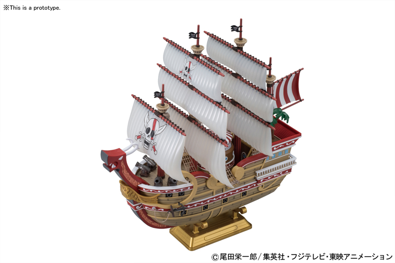 Shanks's pirate ship from the popular anime/manga series, One Piece. This large vessel stretches approximately 12 inches long and 11 inches tall. Ship features realistic trim detailing along its body and unpainted mini figures of Shanks and his crew are included along with a stand.