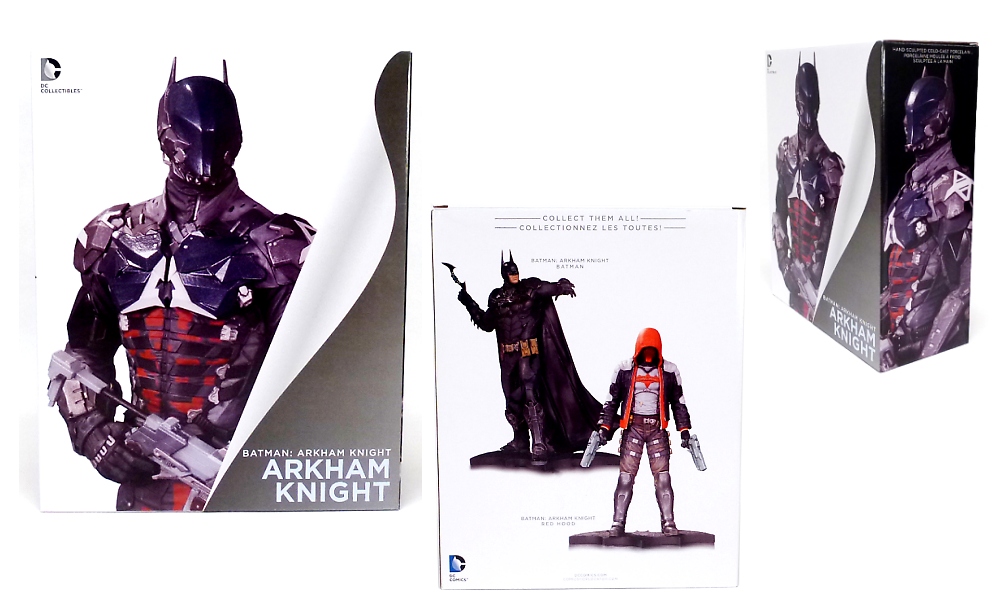 When it comes to packaging for their action figures and statues DC Collectibles has a great theme going. The Arkham Knight statue comes in a slick white box with a minimum of graphics and nothing gaudy. Basically, it’s a package that looks good enough to display if you’re one of those people who don’t actually open their toys... but with a statue that looks this good why would you do that? Anyway, the front panel of the box features the now standard DC “peel” effect with a gray overlay on the right-hand side that’s being pulled over to reveal a close up photo of the statue behind it. At the top left corner is a small DC Collectibles logo and at the bottom right the name of the character. One side panel has another close up photo with a note about its hand-sculpted, cold cast porcelain construction while the other has a full body shot with the height of the figure (10.5 inches) and the sculptor (David Giraud). The top of the box has the logo of the game and the back panel shows off two other statues from DC Collectibles and Arkham Knight, Batman and Red Hood. Again, the minimalist, uncluttered approach is really nice and gives it a sophisticated look.
