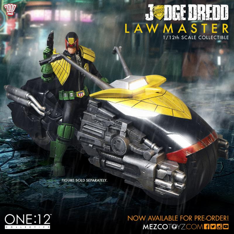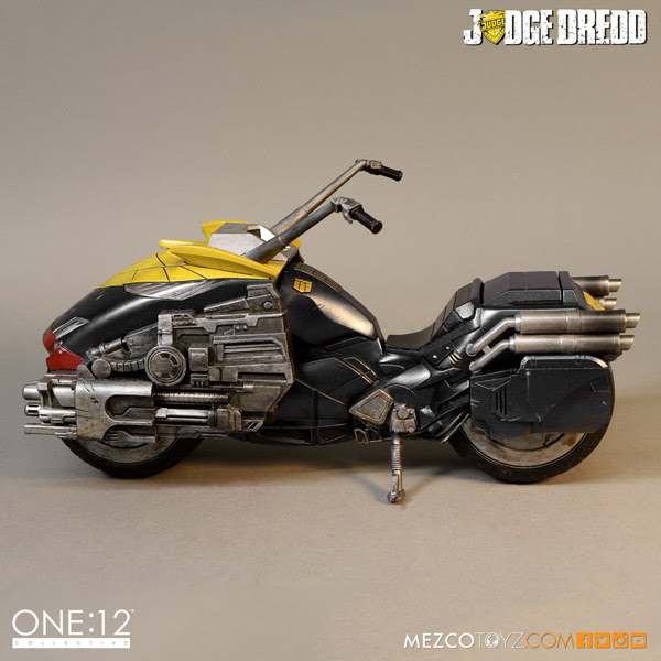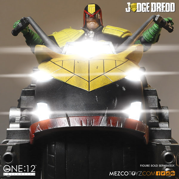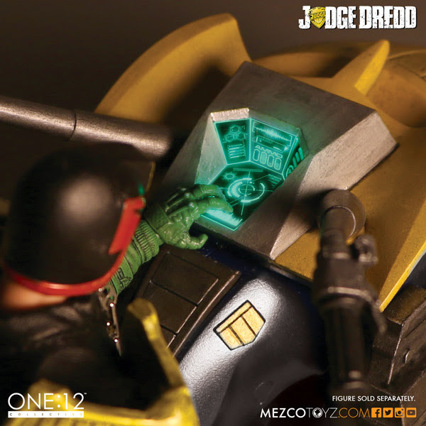 Digitally modeled and specifically designed to interact with the One:12 Collective Judge Dredd figure, the Lawmaster is teaming with amazing details and features. In cooperation with artist Ben Willsher, the One:12 Collective team has created a truly stunning collectable loaded with some incredible features. The Lawmaster's functions include 5 distinct sounds, multiple light-up features, free-rolling rubber-slick tires, turning handle bars, built in handcuff storage pod and a light-up Synitron GK13 onboard computer display.