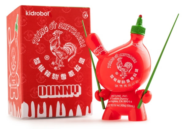 Kidrobot and Sket One haved teamed up to create the Sketracha Dunny. Sketracha Dunny is a designer take on the popular Sriracha hot chili sauce. The Sketracha Dunny measures 3" tall and comes packaged in a blind box. A clear "empty" version of the Sketracha Dunny will be available as a blind chase version with a rarity of 2/5!