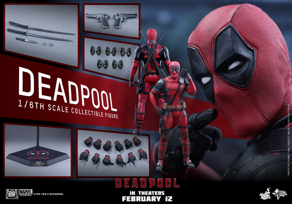 The movie-accurate collectible figure is specially crafted based on the image of Deadpool from the film. It features a newly developed masked head sculpt with 5 pairs of interchangeable eye pieces to create numerous combinations of Deadpool’s expressions, newly developed body, meticulously tailored Deadpool suit with weathering effects, Deadpool’s signature katanas and pistols, variety of interchangeable hands with gestures, and a specially designed Deadpool themed dynamic figure stand perfect for aerial poses.
