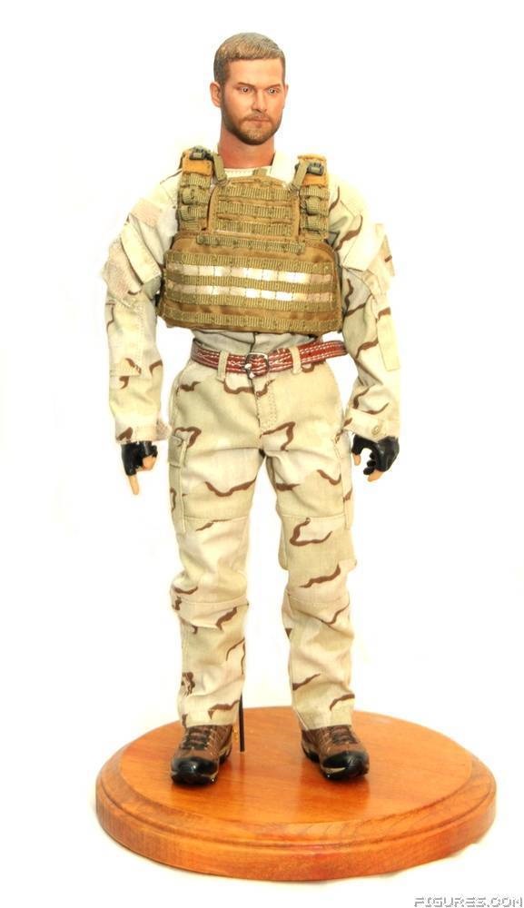 Overtop of the body is a Navy Special Warfare uniform including tan long sleeve tactical shirt, and custom DCU jacket and pants with Galco leather gunfighter belt. The figure includes a pair of Merrel High Top Outland boots, Mechanix 3.0 gloved hands, a 3C Team baseball cap, Desert tan ballstic googles and Wiley X WX Echo sunglasses.