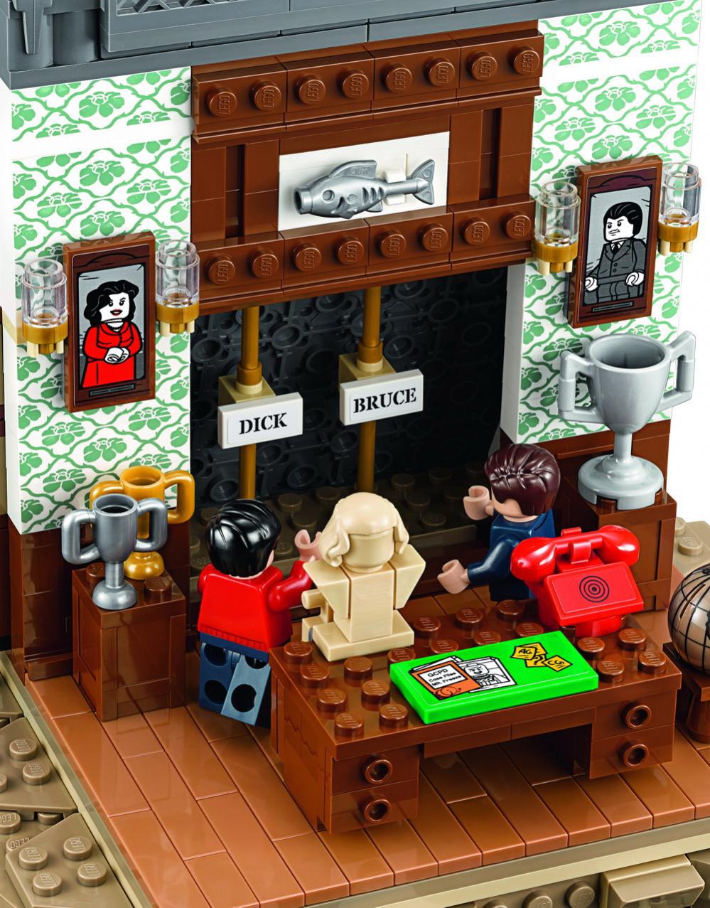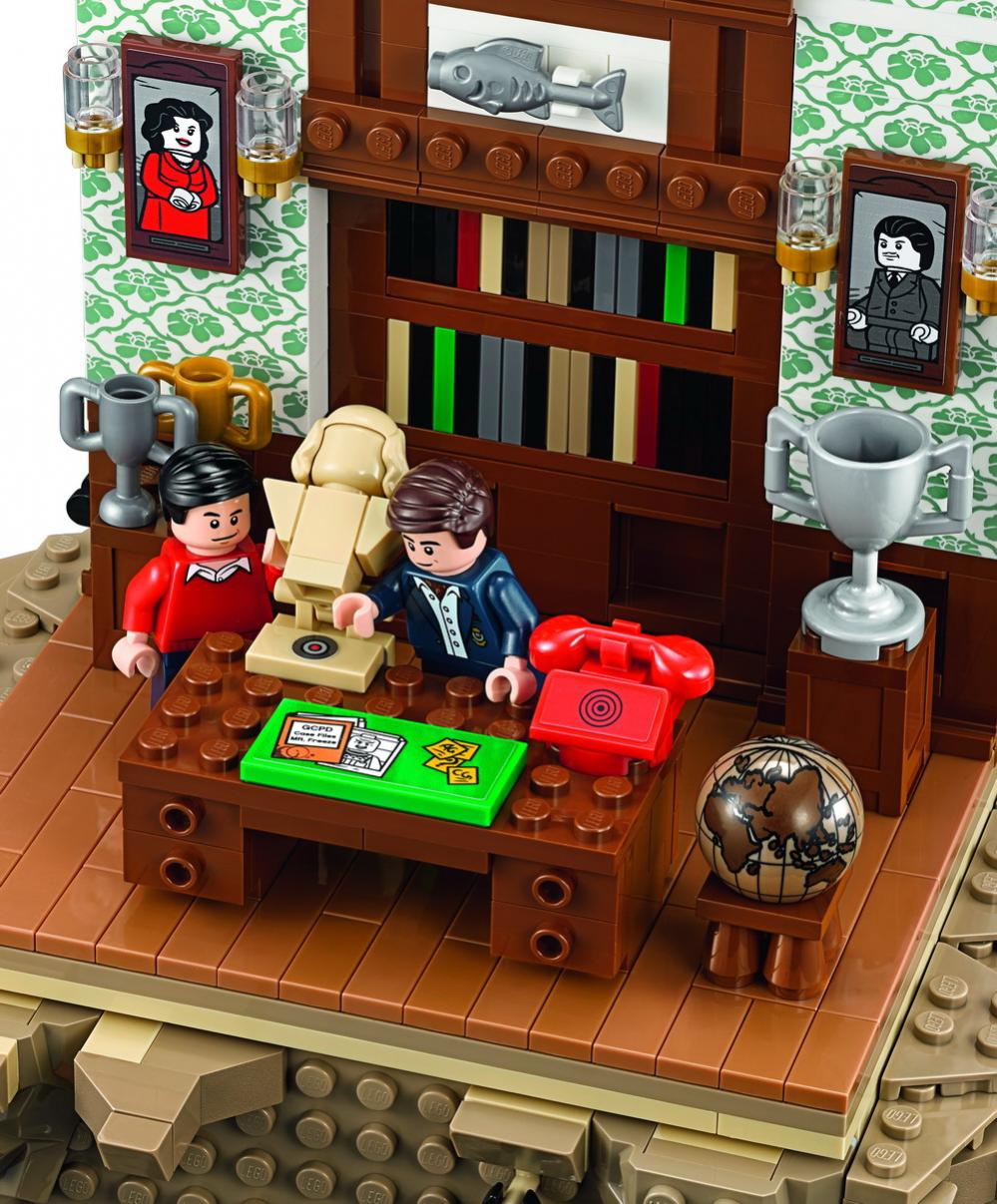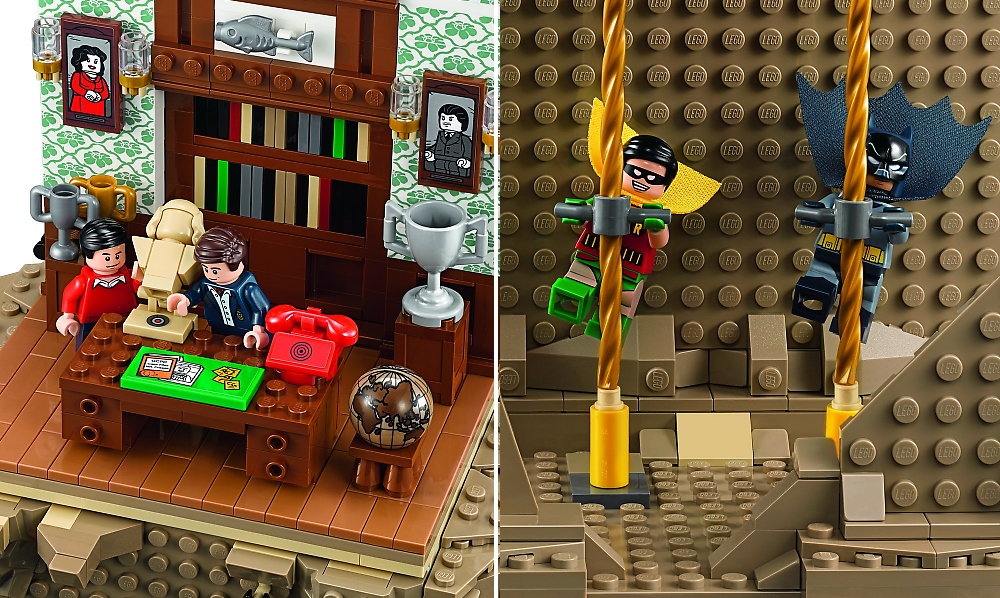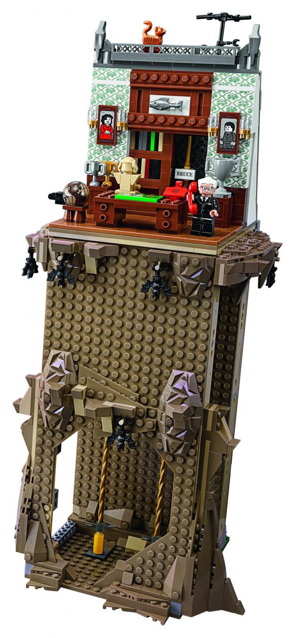 • The Wayne Manor section of the model features Bruce Wayne’s study with the iconic Batphone, a hinged Shakespeare bust with secret button underneath, sliding false bookcase to access the Batpoles, and assorted elements including decorated wallpaper bricks, wall lamps, framed portraits, a framed fish and trophies. It also includes an exterior wall for climbing, with an opening roof for easy access to the Batpoles and an aerial element.