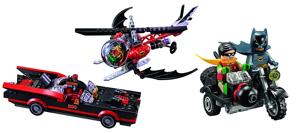Help Batman and Robin to drive the villain intruders from the Batcave, featuring a Bat Lab with Batcomputer, plus the Batmobile with stud shooters, Batcopter with flick missiles and the Batcycle. This special model, based on the classic 1960s TV show, also has a Wayne Manor section with an exterior wall to climb on and Bruce Wayne’s study featuring the iconic Batphone and a false bookcase that slides open to reveal the secret entrance to the Batcave. Before spiraling down the Batpoles into the Batcave, change identity from Bruce Wayne and Dick Grayson into Batman and Robin (separate minifigures included).