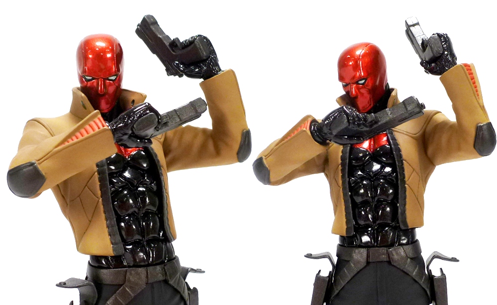Red Hood’s sculpt (by Naoya Muto) is pretty great and deserves an up close look. Just like in the comics the anti-hero wears a variety of materials in his clothing, and those are replicated with appropriately different details. There are nice creases in his pants and jacket, along with seams, zippers, buttons, and the like. There are even armored kneepads protruding from the slacks! Jason wears heavy-duty combat shoes with thick soles, and over his pants are twin, empty holsters with the flaps unattached. Visible underneath the jacket is Red Hood’s armored breastplate, sculpted with deeply cut muscle details. His overall helmet is mostly smooth with twin lines running over the top and a fearsome face depicting only eyes and a nose. Red Hood’s pistols are nicely detailed as well.