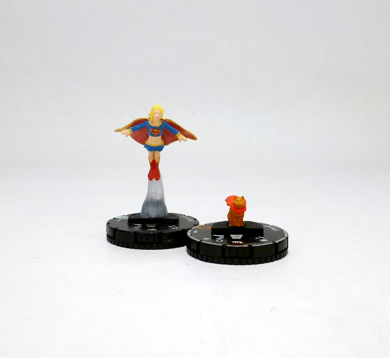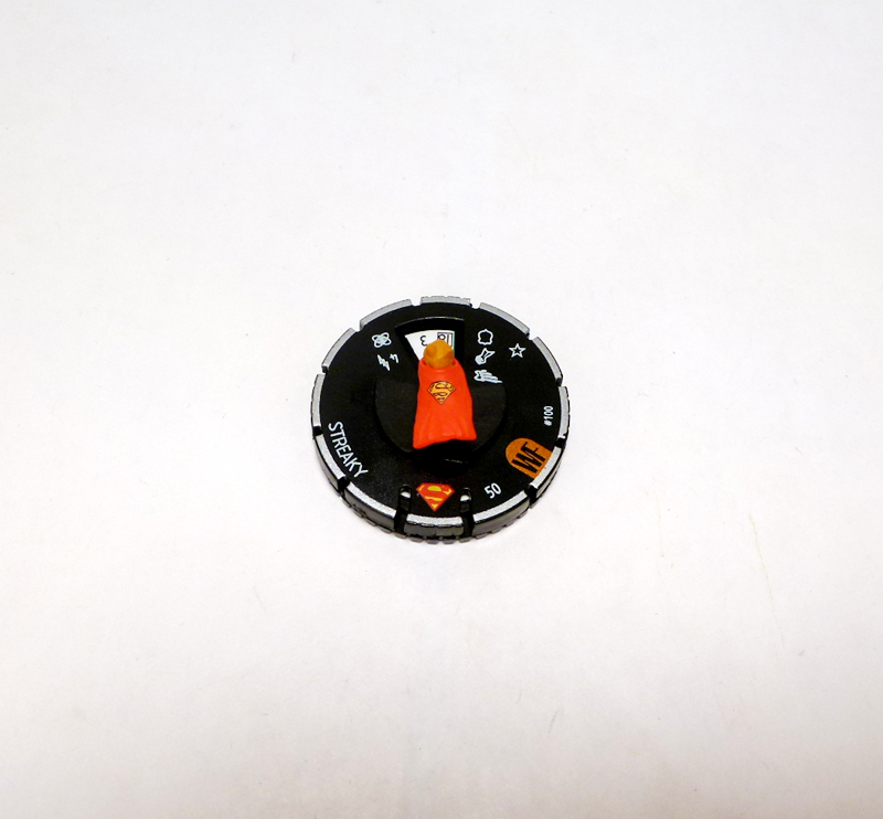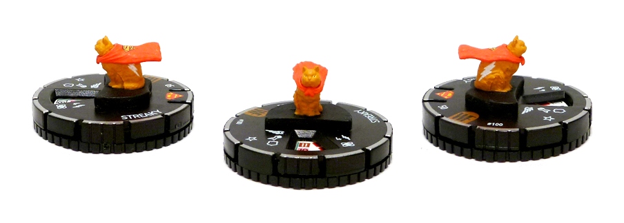 Streaky’s debut in HeroClix comes courtesy of the feline sculpt that appears twice in the main World’s Finest set for both the generic Black Cat and the familiar of Klarion the Witch Boy named Teekl. The base sculpt is a diminutive kitty that’s deceptively straightforward, but any cat lover/owner will immediately recognize the hunched sitting pose and if you look closely you can see fur details, a tail wrapped around the left side of its paws, as well as a cute little face. And while the generic is, of course, black and Teekl is brown with pale spots on the face and feet, Streaky is an orange kitty with intense yellow eyes and the character’s trademark white lightning bolts on either side of its body. Even better, the super cat adds to the base sculpt with a flowing red cape tied around its neck complete with the “S” shield in yellow!