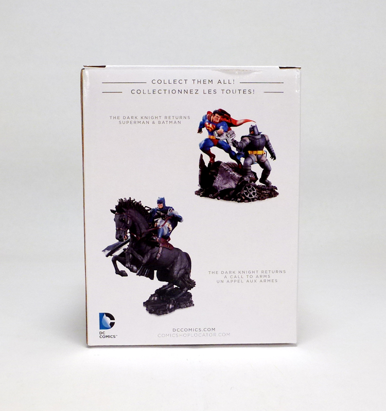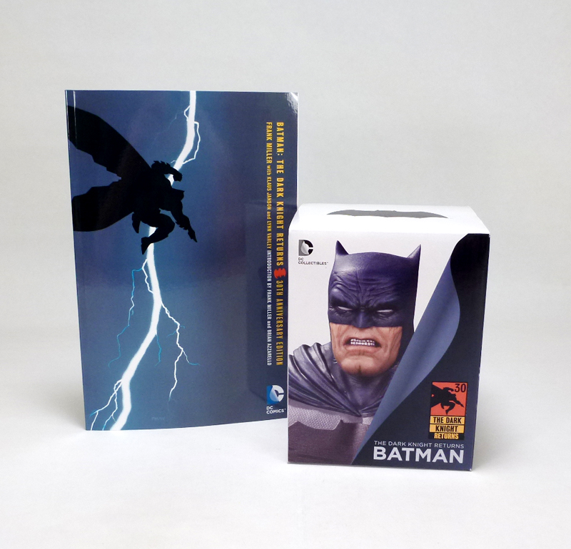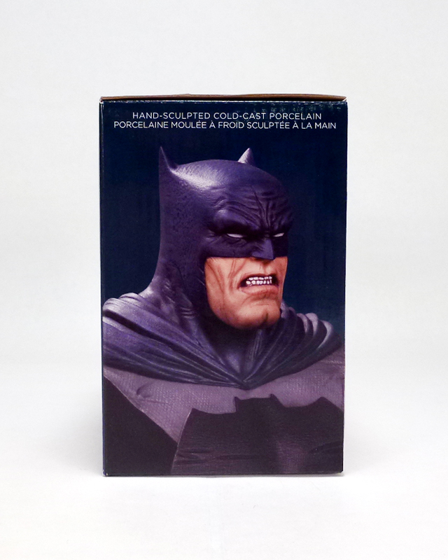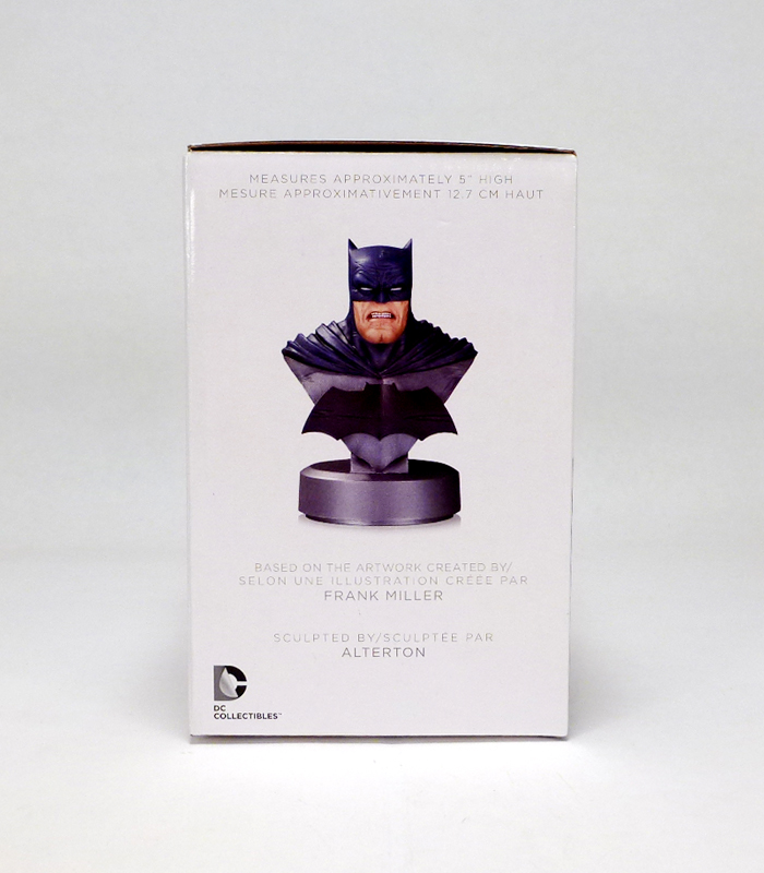 If you’re a fan of the solid and brutal look of the hero from Miller’s original work, check out the brand new Batman: The Dark Knight Returns 30th Anniversary Bust. It comes packaged in the standard DC Collectibles box with crisp photography and all the info you need including the dimensions (5 inches tall) and sculptor (Alterton). [Note: for some reason my camera gave the packaged photos a somewhat purplish tinge. In person it is blue and white as you’d expect.] The back panel shows off two other DC Collectibles Dark Knight Returns statues, while the front is emblazoned with the commemorative 30th anniversary logo.