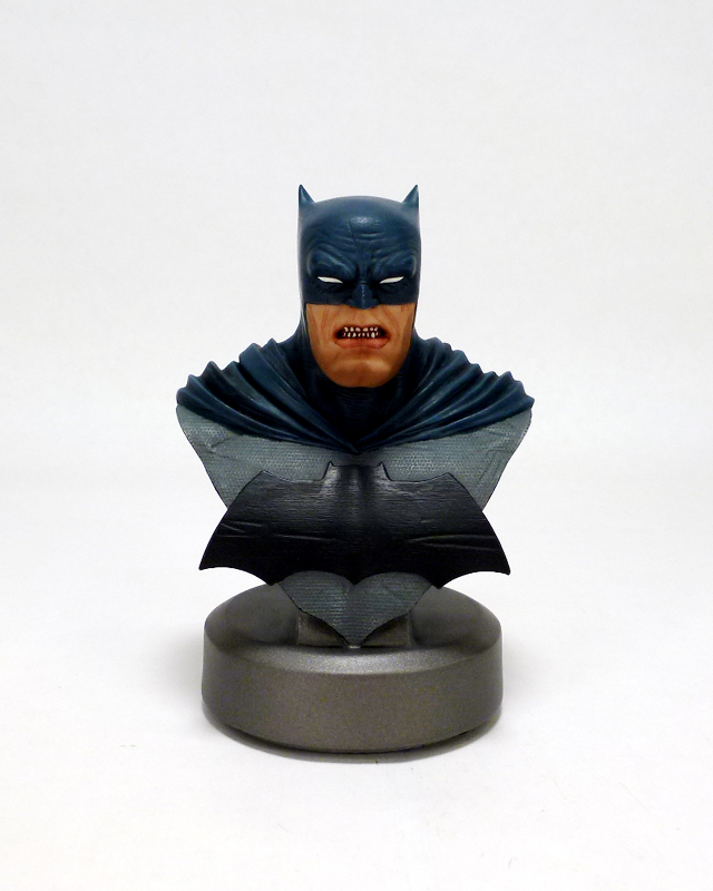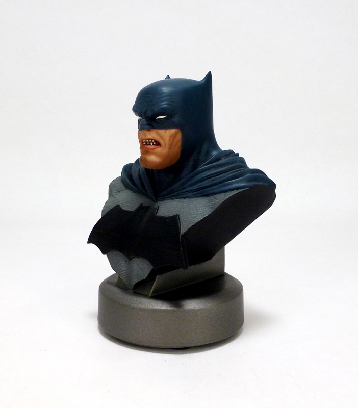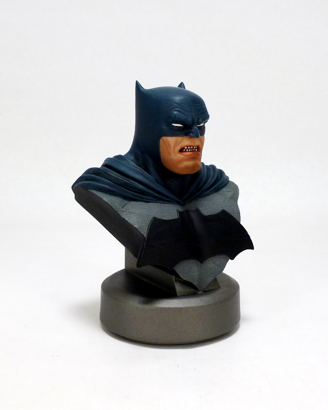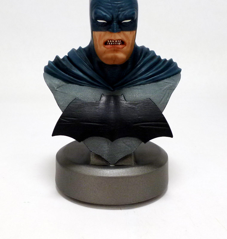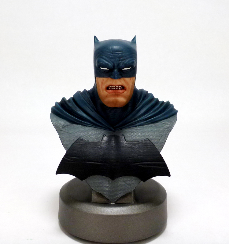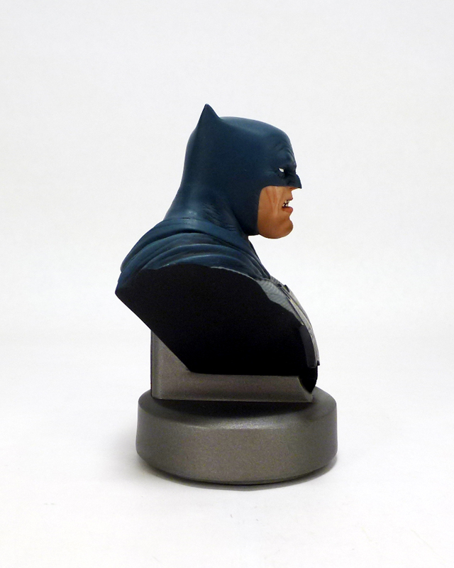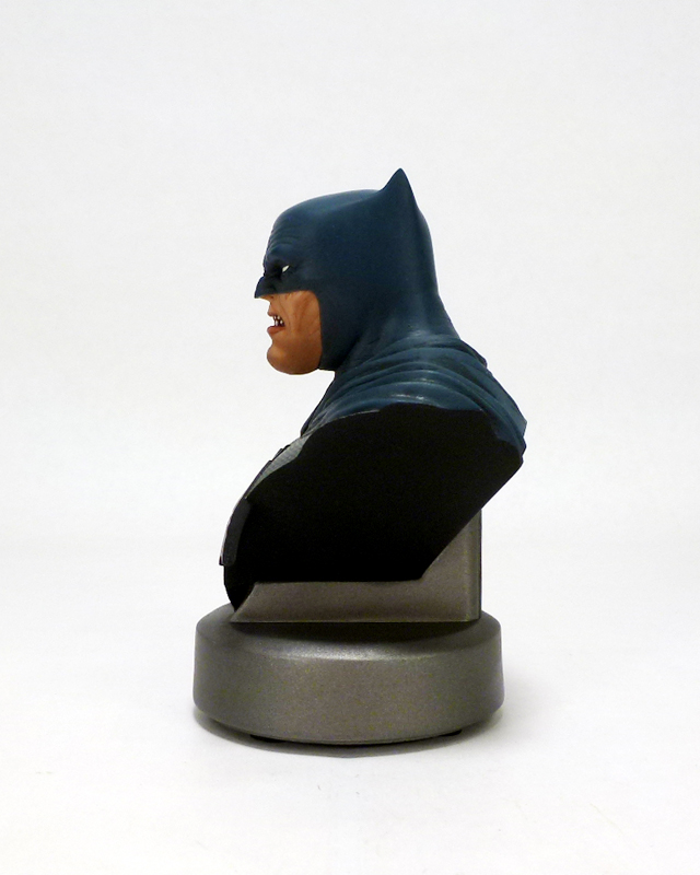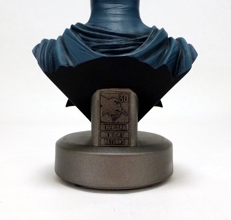 The bust may be only 5 inches tall but it packs a ton of character into a small size. Batman is older and grittier than in most stories, not to mention thicker. He’s a man who has seen it all and has suffered much, and that weariness and anger shines through in his grim expression. Batman includes a triangular section of his upper body with the Dark Knight Returns specific costume: blue on gray with a huge black bat symbol. Over the hero’s shoulders flow the costume’s cape, and while the cowl covers the top part of his face as usual it has uniquely tiny “ears.” Bruce’s eyes are covered by white lenses, but his stocky lower face and jaw are revealed with their accompanying scars and ferocious snarl. The sculpt on this bust is phenomenal, bringing out every crease and wrinkle in the aging hero along with the intricate texture of his costume and more. There’s an added bonus of a 30th anniversary commemorative plate on the back side of the bust, and each Batman is numbered on its underside.