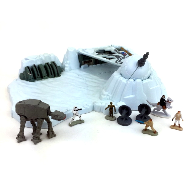 The miniaturized sets in question were the first three offerings I encountered in Galoob’s exceptional Star Wars Micro Machine line. I was a Return of the Jedi kid, so the Endor and Death Star playsets were my favorites, but the Hoth battle playset included a Luke Skywalker with blue lightsaber, which meant that set was a must-have as well. In fact, with all three initial releases, one would acquire a veritable line-up of essential original trilogy characters: