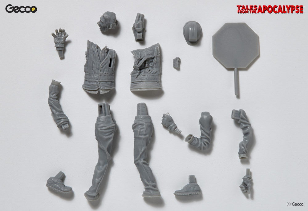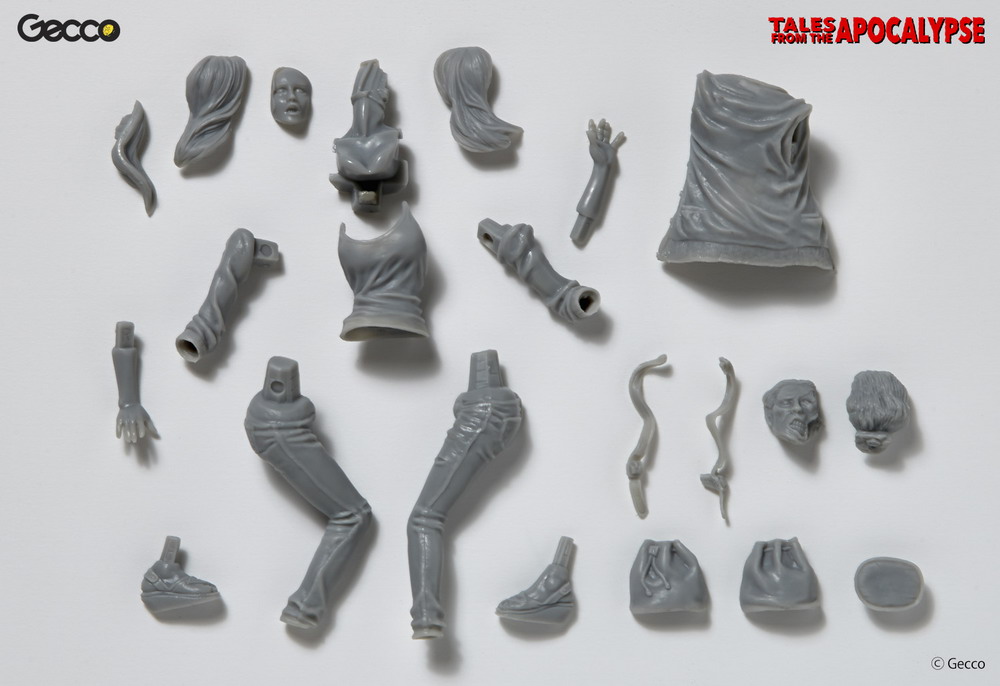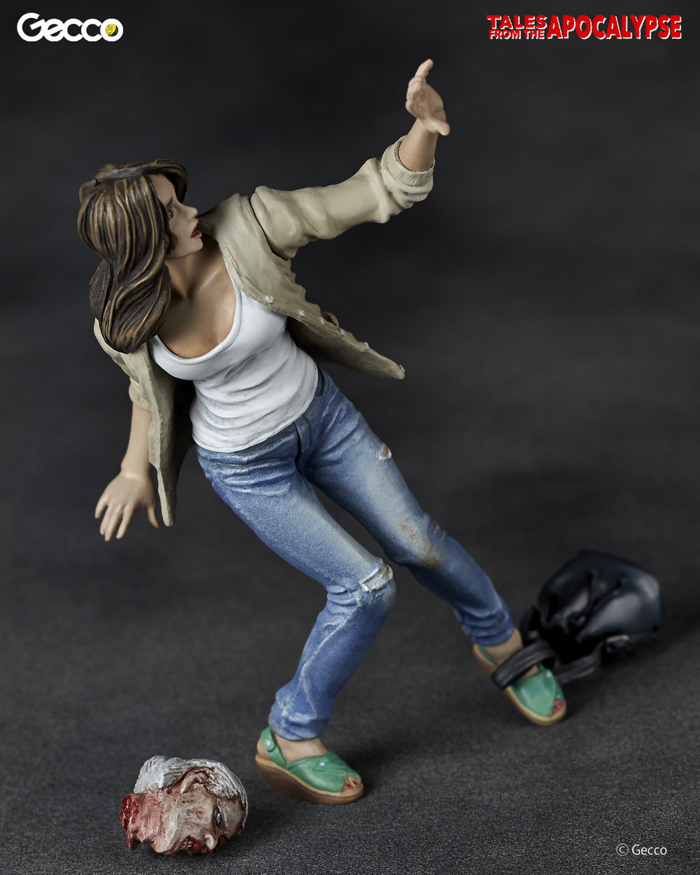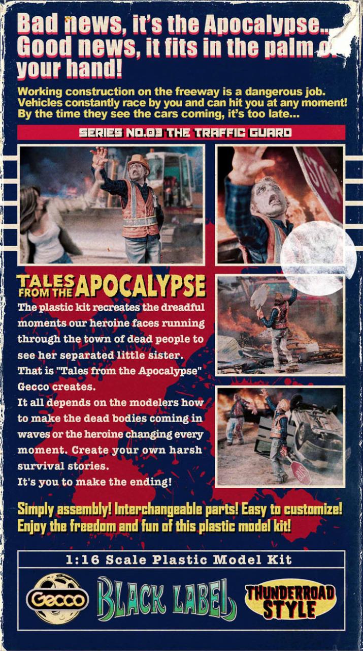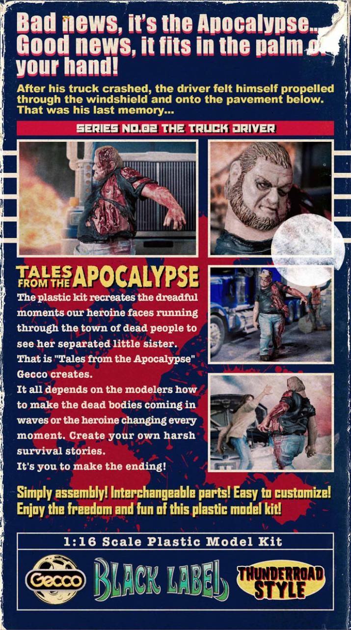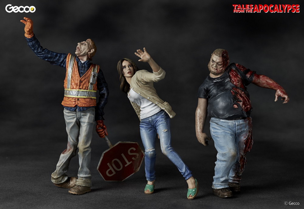 Gecco presents Tales from the Apocalypse, a new series of 1/16th scale Zombie plastic model kits. The premise of the line is styled after an old horror movie, the first wave of model kits capturing characters from a key moment in the make-believe movie: "Scene 1: Day 1, 11:50 am on Freeway". Even the packaging for each model kit is brilliantly designed to appear as a VHS tape box!