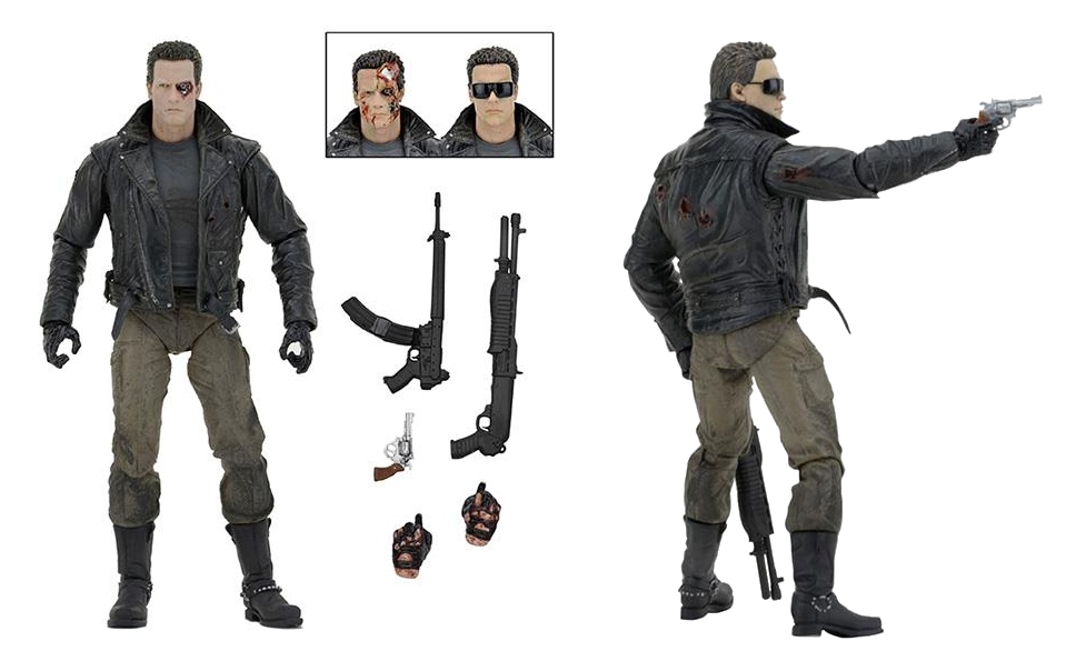 NECA expands their "Ultimate" collection with a new 7-inch action figure of the Police Station Assault T-800 as seen in the 1984 sci-fi film, The Terminator. This definitive collector's version of the Terminator features a detailed, bullet-riddled motorcycle jacket and bears the likeness of Arnold Schwarzenegger. The deluxe 7" scale figure has over 25 points of articulation, 3 interchangeable heads, 2 pairs of hands, and SPAS-12 shotgun, AR-18 assault rifle, and Smith & Wesson Model 15 handgun accessories. It comes in deluxe window box packaging with opening flap.