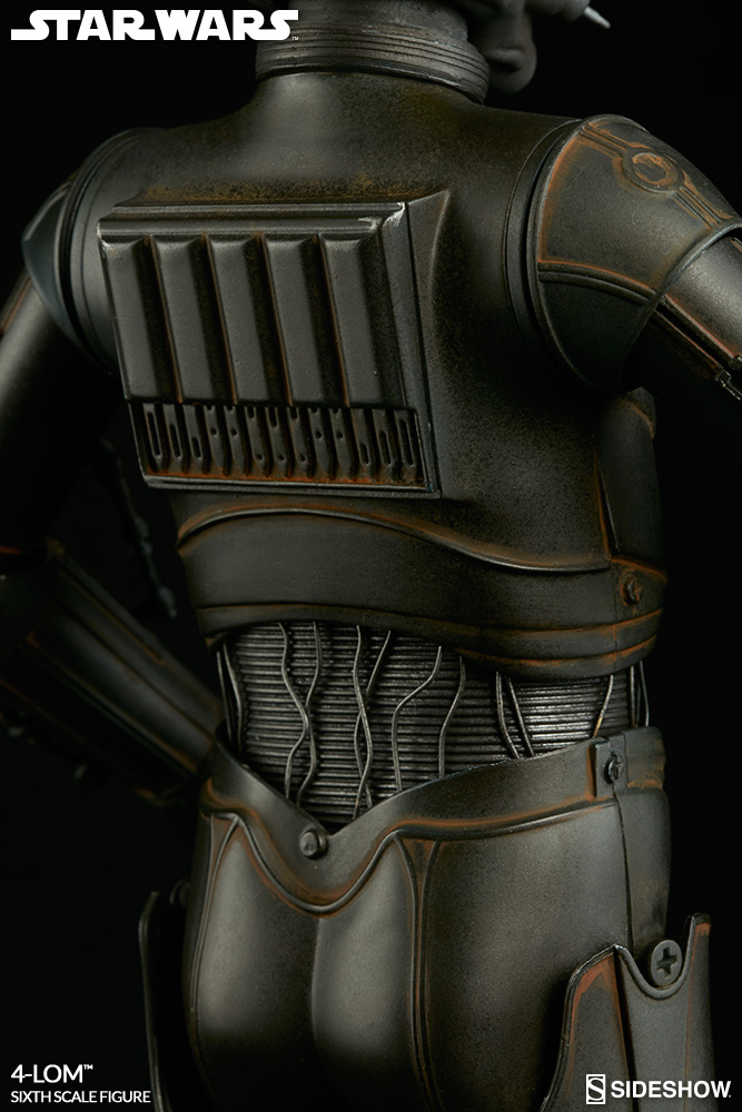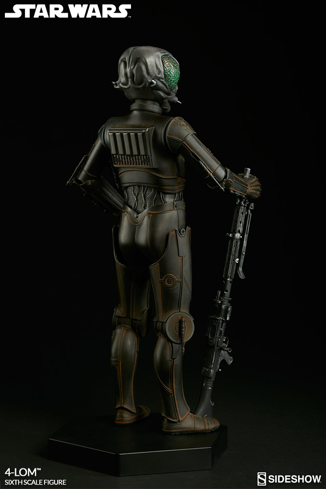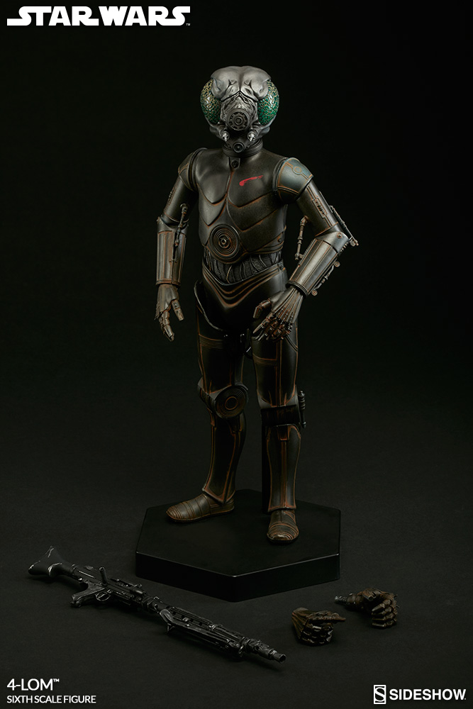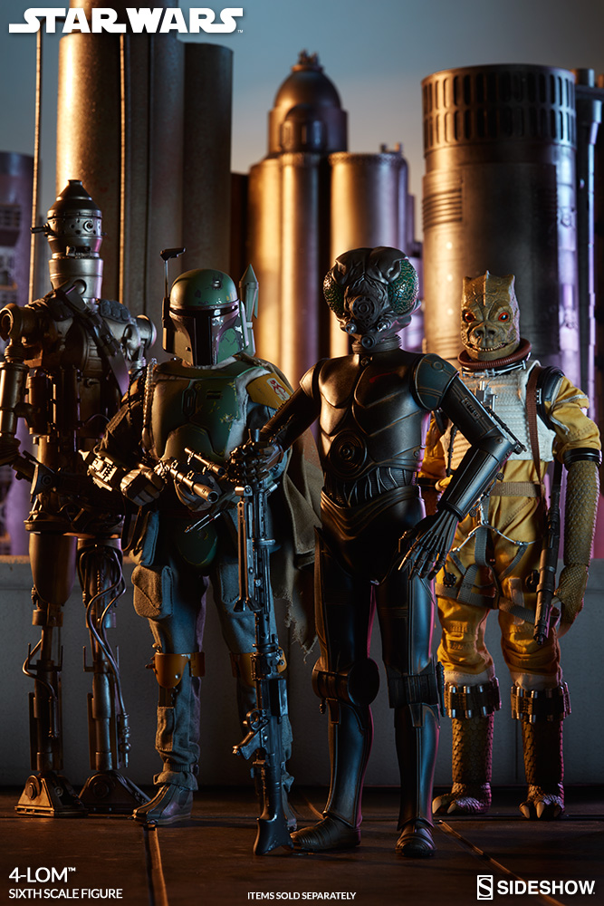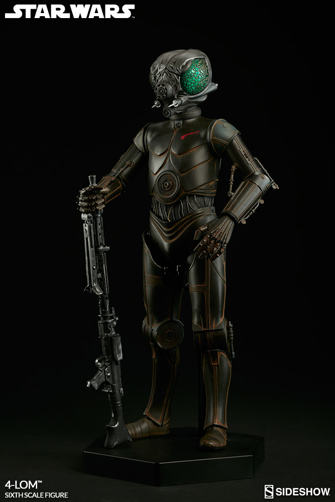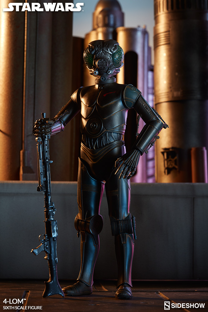 Sideshow continues their series of bounty hunters seen in Star Wars: The Empire Strikes Back with the deadly modified Protocol Droid, the 4-LOM Sixth Scale Figure.