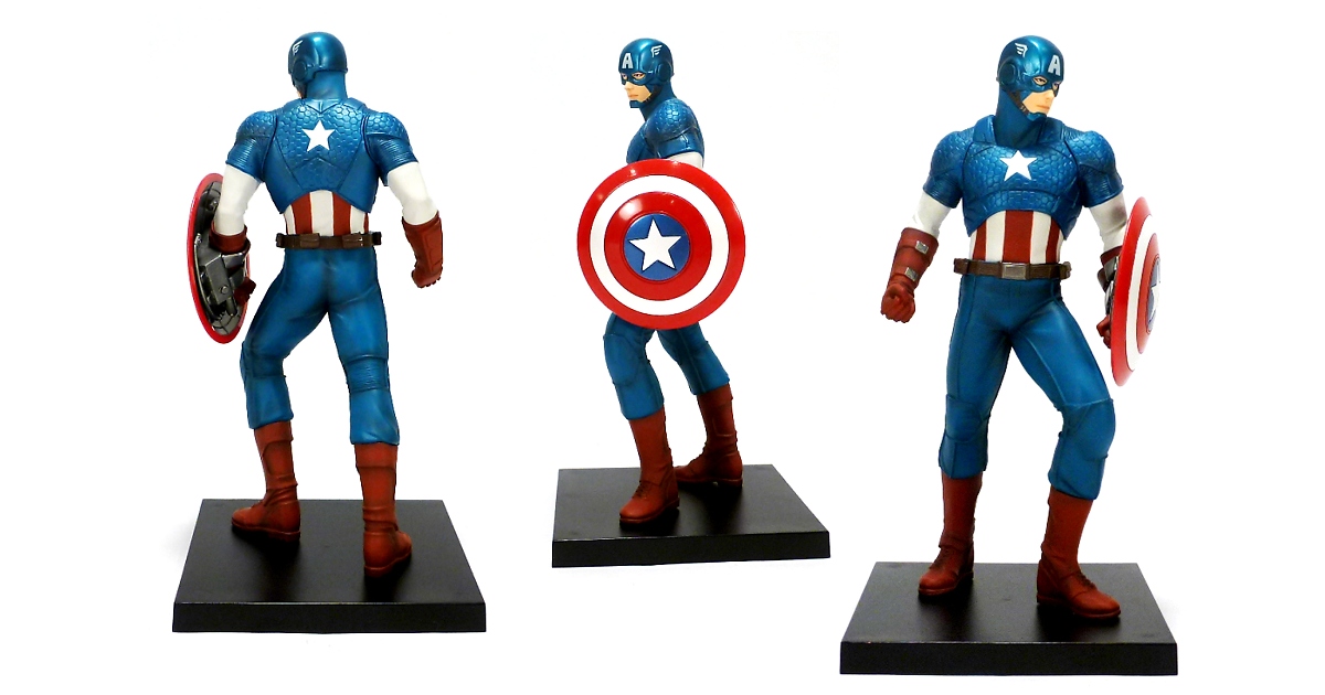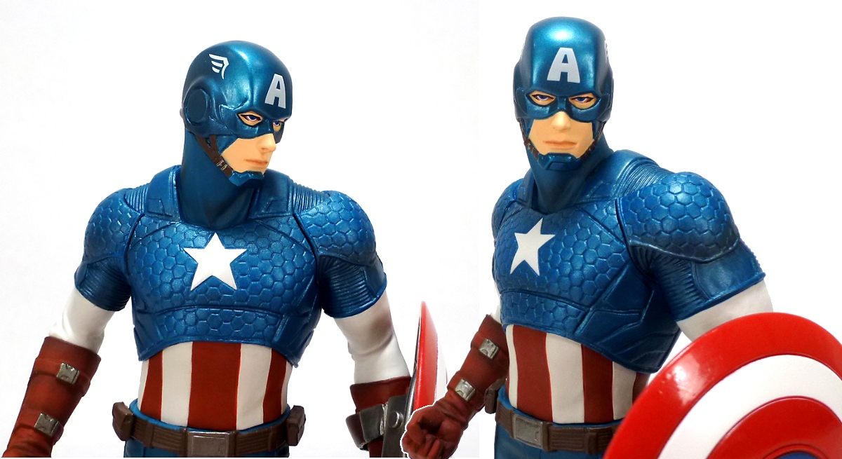 If you’ve picked up or seen any of the DC Comics ARTFX+ Statues you’ll know they come in very distinctive boxes that are mostly clear with frosted sides and themed colors. For the Marvel collection Koto has gone in a different direction and it’s pretty cool. Captain America comes in a bold package covered in artwork and showing off the figure itself. The entire box is covered in a background of overlapping Cap image in blue and black, on top of which are the usual logos, the inspiring portrait by Adi Granov, photos of the statue, and more. The back panel of the box has the artwork of the full lineup of Marvel Now Avengers along with detail photos of Cap and a description of the statue. Inside the box is a plastic tray holding the four components of the statue (which is easily assembled in seconds) and a sleek black display base.