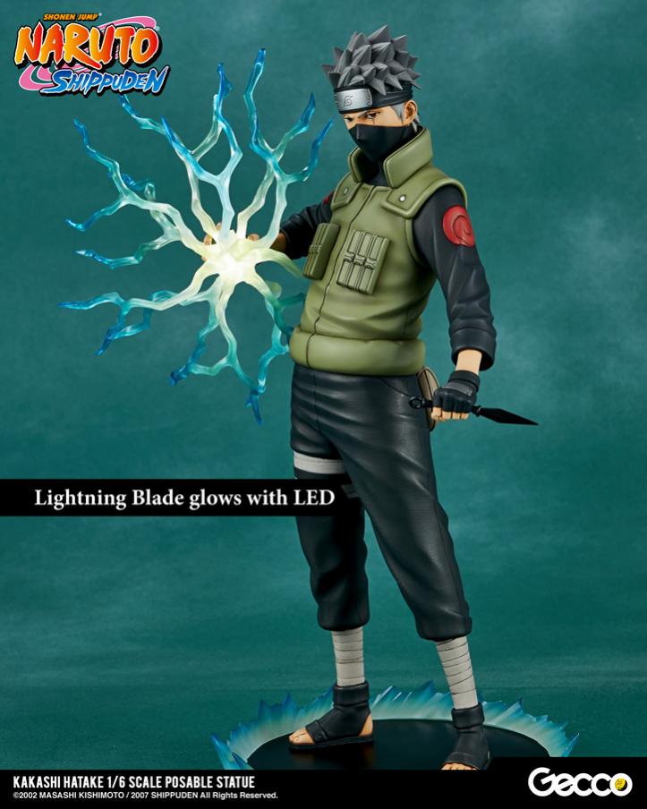 - From holding the Kunai knife in his left hand, a bold look on his face with his SHARINGAN open and the explosive lightning effect recreated on the base, this piece is certain to please the most exacting collector!