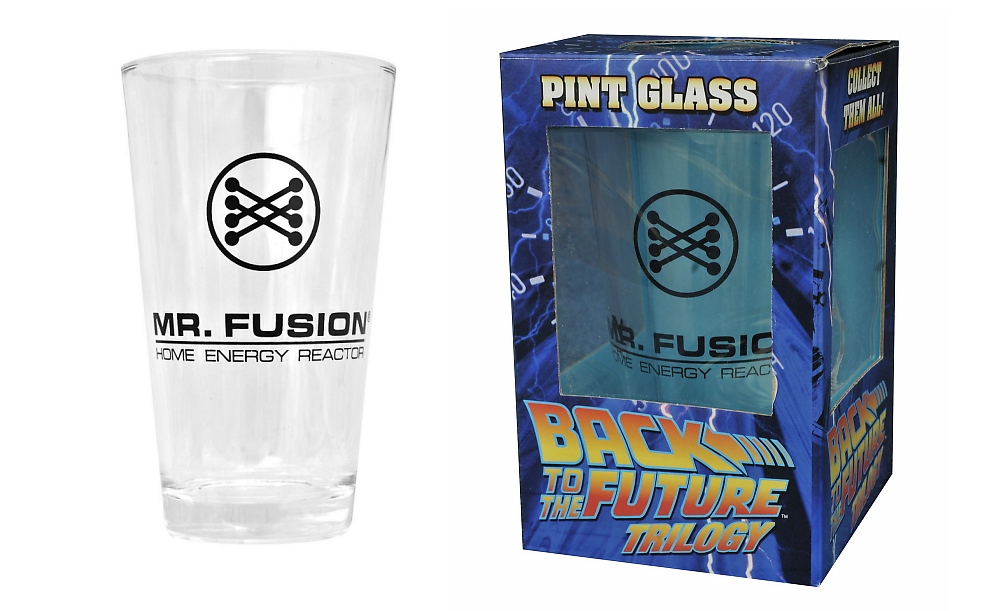 It’s the drinkware of the future! With 2015 in the rear-view mirror, Mr. Fusion mania has taken over the nation, and this new pint glass from DST proudly displays the Mr. Fusion logo! Fill it with your favorite blended beverage, and turn your kitchen into a futuristic café, an Old West saloon, or a mad scientist’s lab! WARNING: Will not turn garbage into a delicious beverage. Packaged in a full-color window box. (Item # JAN162260, SRP: $10.99)
