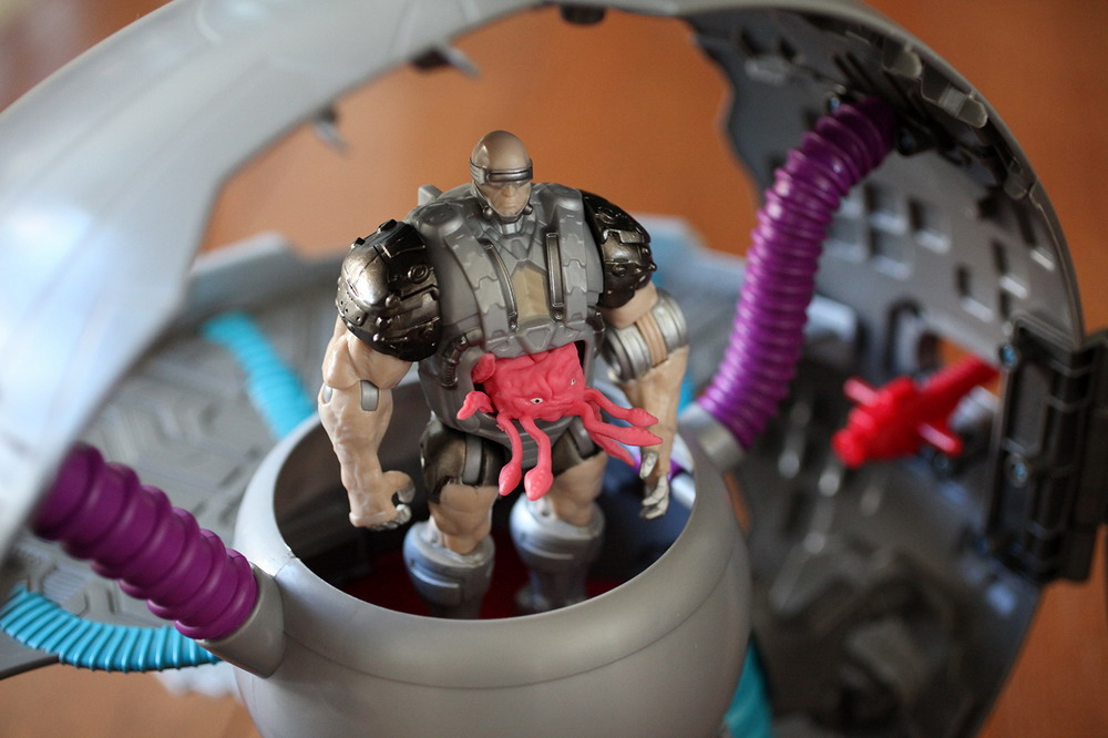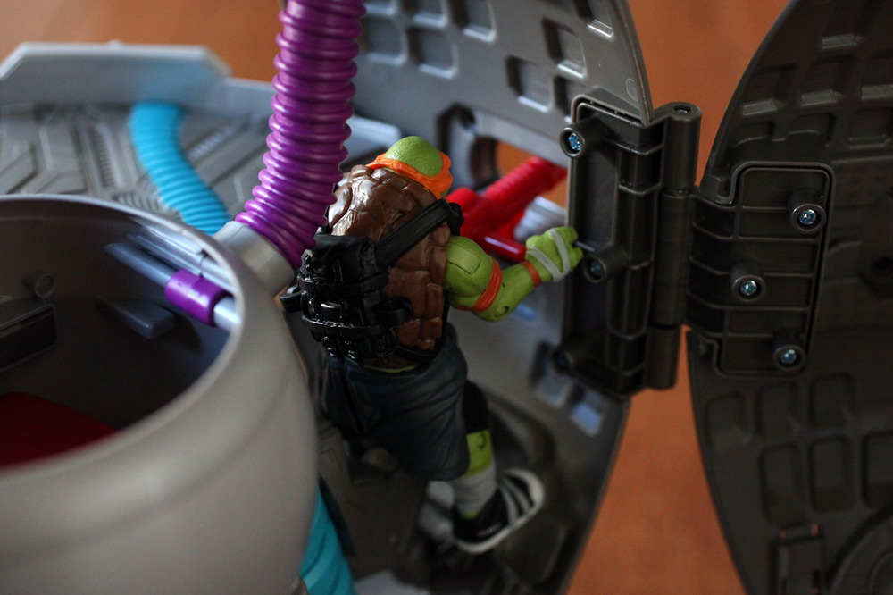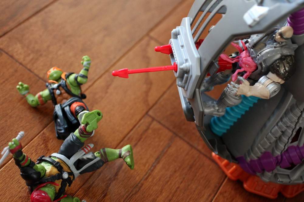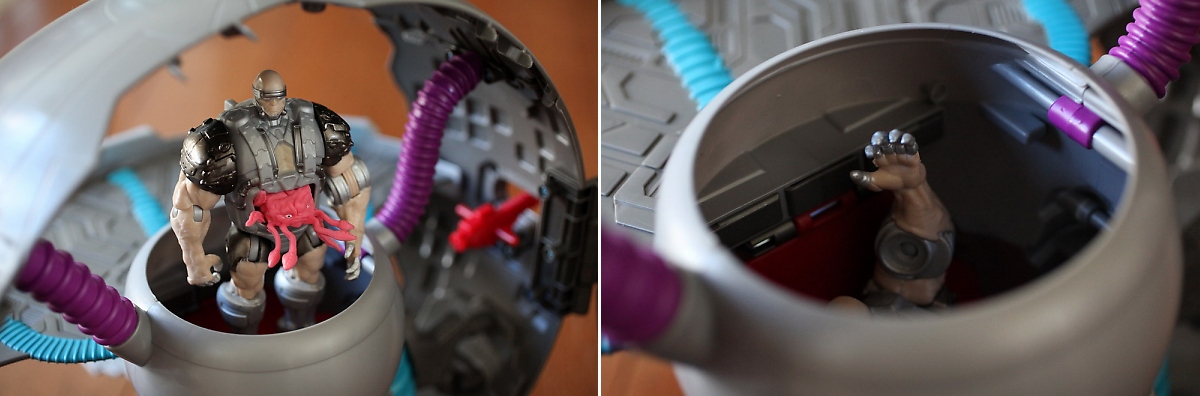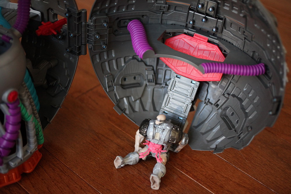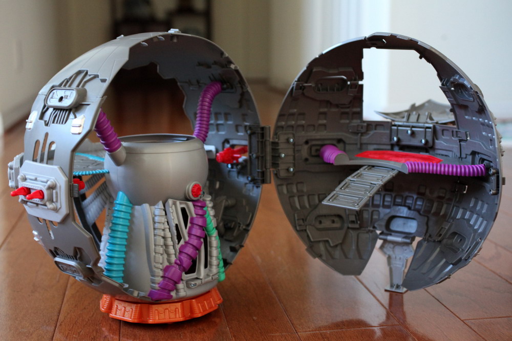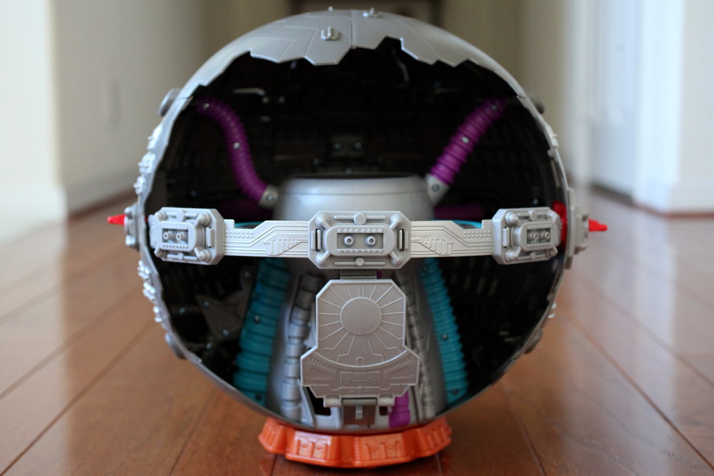 Kraang's Interdimensional Fortress opens to over 2 feet wide, has a trap door, secret trap slide, and aim & fire weapons. Only one side of the Technodrome opens, which is a shame as it would be great to have a completely closed ball of a fortress like the original. The side that opens also has a hidden entrance.