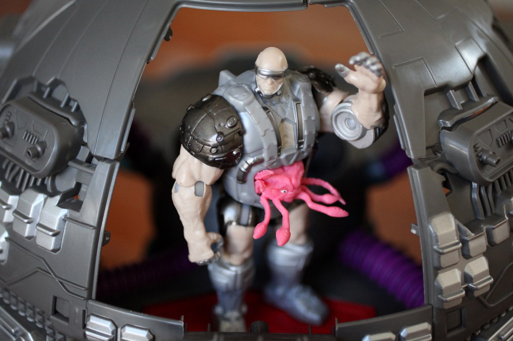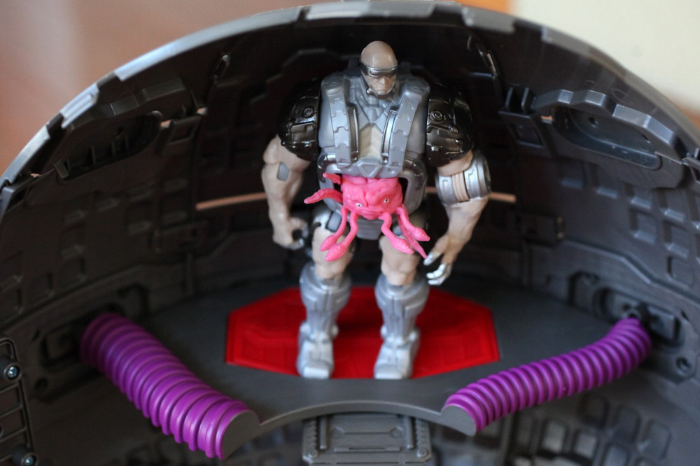 The center area of the Technodrome is where Kraang can stand and drive his base into battle, but it also serves as a trap door that leads into a jail. The base has some painted parts and wires, enough to keep it colorful. The exterior looks pretty neat actually with the dark gray and silver highlights.