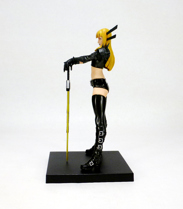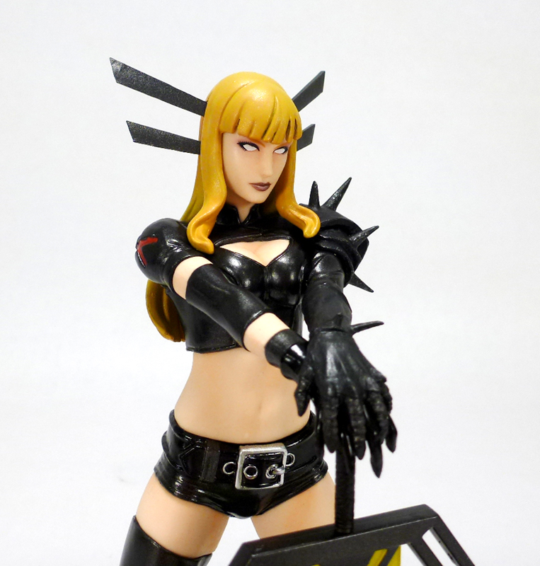 Illyana Rasputin has always been a very interesting character, combining themes like youth and innocence with corruption, dark arts, and the taint of evil. The mystical mutant appears in Adi Granov’s X-Men illustration in a fierce pose, showing off her power as well as her allure. The statue replicates the artwork perfectly, starting with the strong stance as Magik leans on her massive Soulsword with both hands while standing with her feet more than shoulder width apart. A child no more, Illyana wears her distinctive Marvel Now costume with boots, thigh high stockings, very short shorts, a halter top, an armband, and a glove all in sleek black that looks like leather.