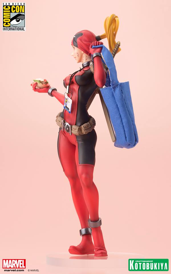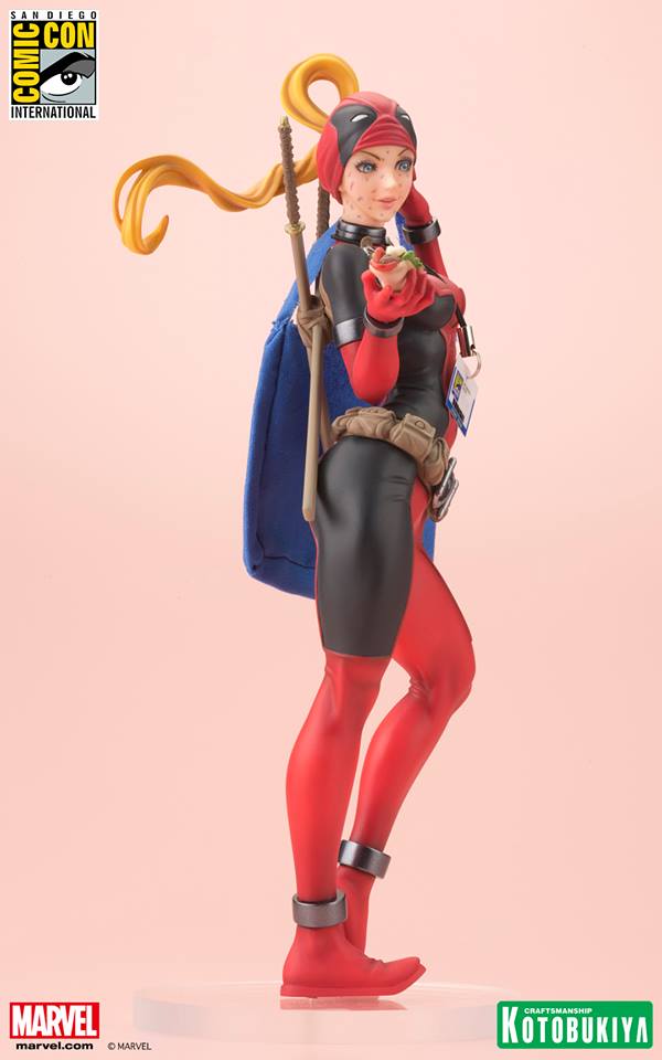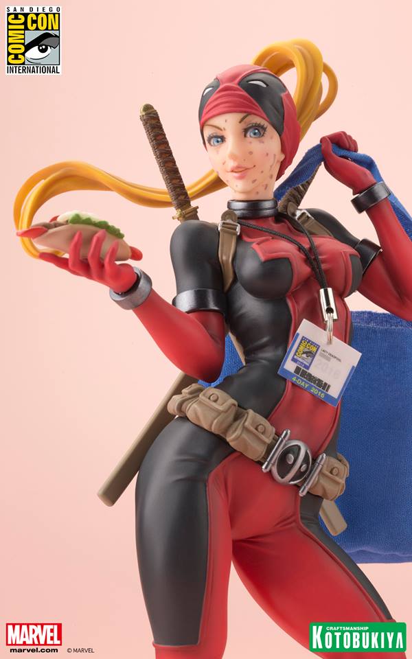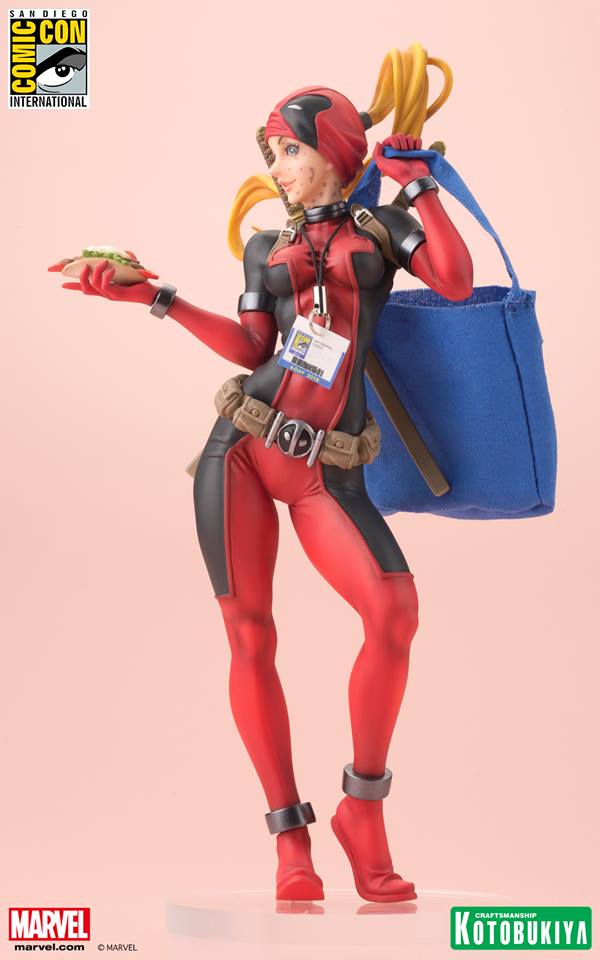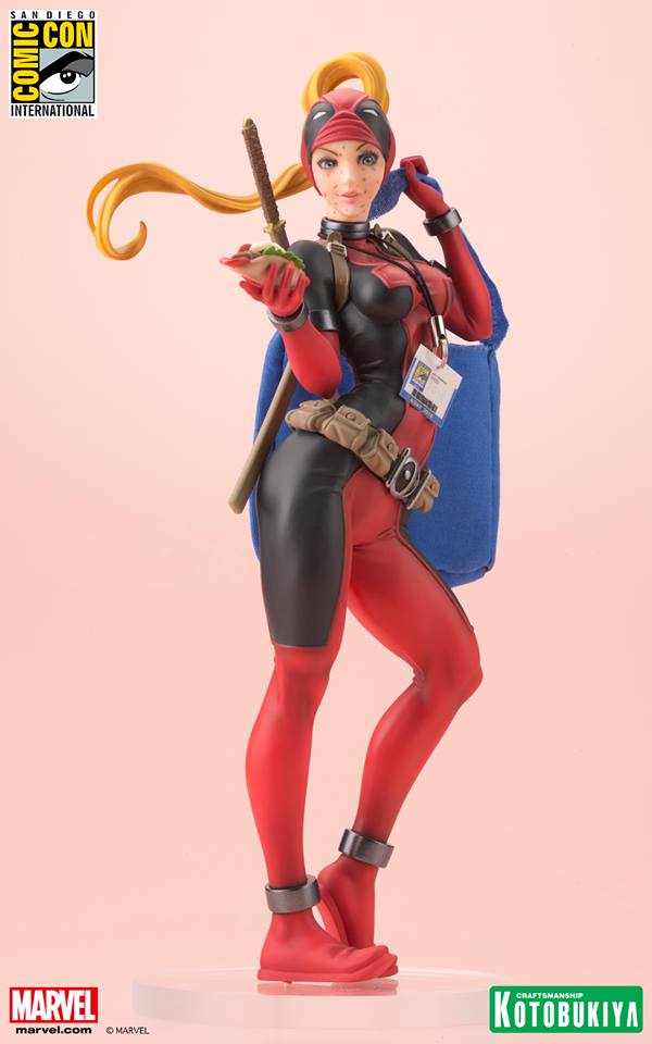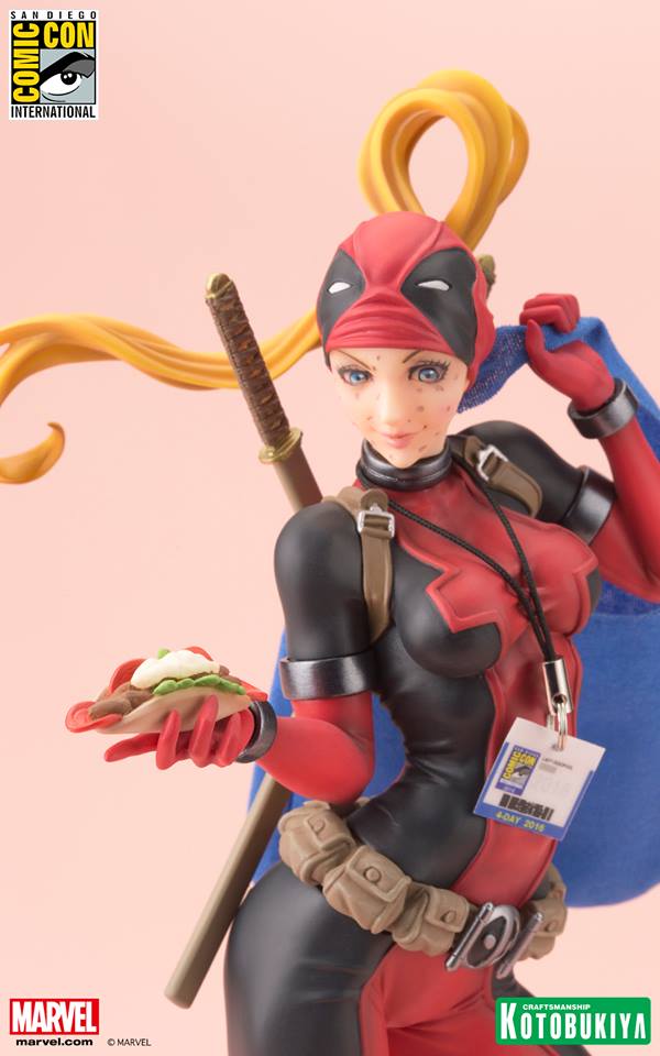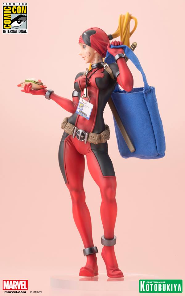 The Lady Deadpool SDCC exclusive edition features a brand-new head sculpt and accessories including Gyro, badge, lanyard and bag with the official Comic-Con logo on it. As an added bonus, all purchases will also receive a second bag accessory with the Kotobukiya & Kotous.com logos on it. Parts from the previous Lady Deadpool Bishoujo statue are also interchangeable with this release so you can mix and match to create your own distinct look!