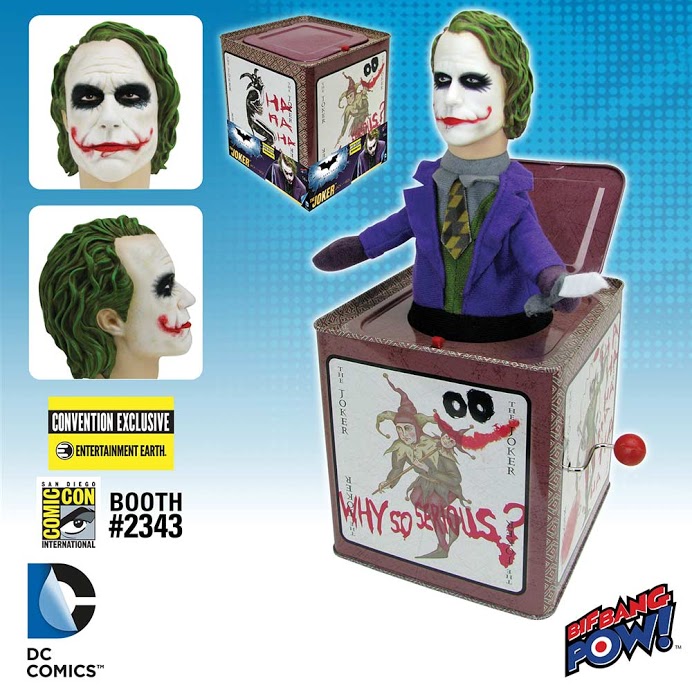 What is lurking inside this musical tin box? Crank the retro-styled Jack-in-the-Box handle to play "Pop Goes the Weasel" as you anticipate that spine-tingling moment where... POP! Out comes The Dark Knight The Joker Jack in the Box - Convention Exclusive from Bif Bang Pow!