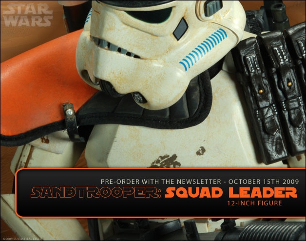[HR][/HR]Sideshow Collectibles' legion of armored 1:6th scale Star Wars action figures continues to grow with the addition of a new Sandtrooper: Squad Leader. This high-ranking Imperial soldier will be available to pre-order with the release of Sideshow's Newsletter later today. Stay glued right here for ordering link and complete figure details.