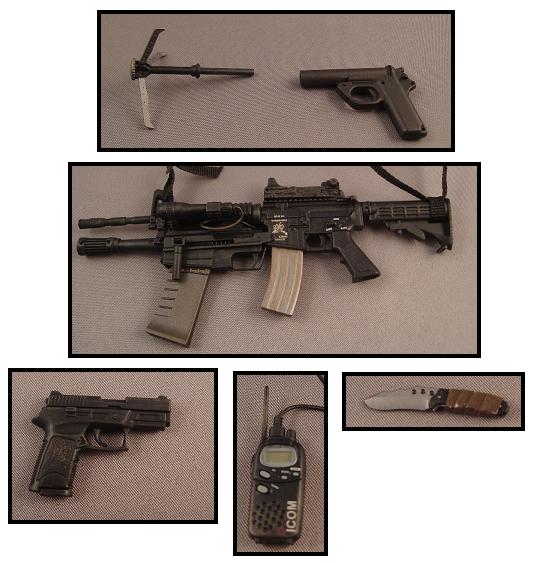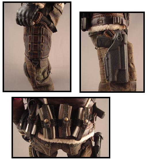 The figure also includes a Tactical full body harness, Headset, Radio, six M4 magazine pouches and seven magazines (above), 2 Pistol Magazine pouches and three magazines, one shotgun magazine, four Demolition blocks, a Drop leg panel (above), a grappling hook and launcher, spring loaded pistol, M4 rifle with spring loaded shotgun attachment, and finally a wrist harness, knife and knife sheath...everything needed to whoop Sky-Net’s butt!