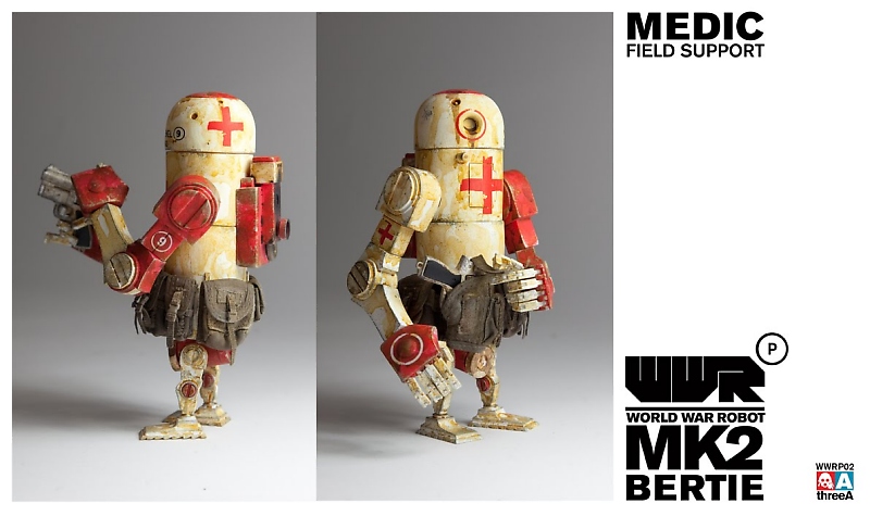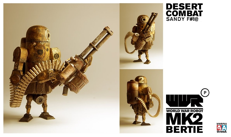 3A Toys will begin accepting pre-orders on their next wave of World War Robot Portable (WWRp) action figures tomorrow, October 22nd, at 6pm EST (October 23rd, 9am Melbourne Time). Designed by renowned sci-fi/fantasy artist Ashley Wood, this group of 6-inch scale battle-scarred robots will focus around the Bertie MK2. Singles will be carried by select retailers at a unannounced date, but bambalandstore.com will be the place to pre-order them first as two deluxe action figure sets. These sets will include: