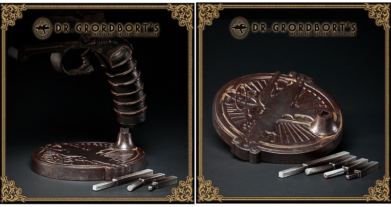 [HR][/HR]Cast from 100% pure Tremontium (tastes and smells a bit like metal in our atmosphere), Grordbort Industries' Universal Gun Stand is an absolute necessity in polite society. WETA presents their first Raygun accessory, a full metal display stand compatible with their entire catalog of collectible weapons, including: