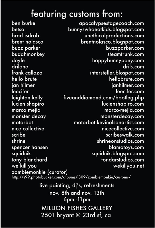 As you can see from the flyer's lineup below, Blamo has tons of well known customizers, a good selection of talented artists (including the creator of Emily Strange), as well as several clothing designers and a few close friends of Blamo all working on a figure. Check out the amazing results at the show.