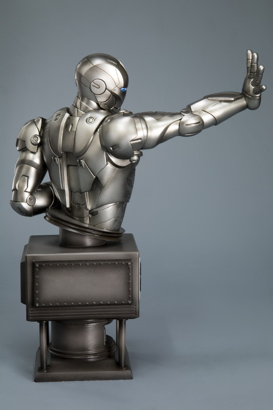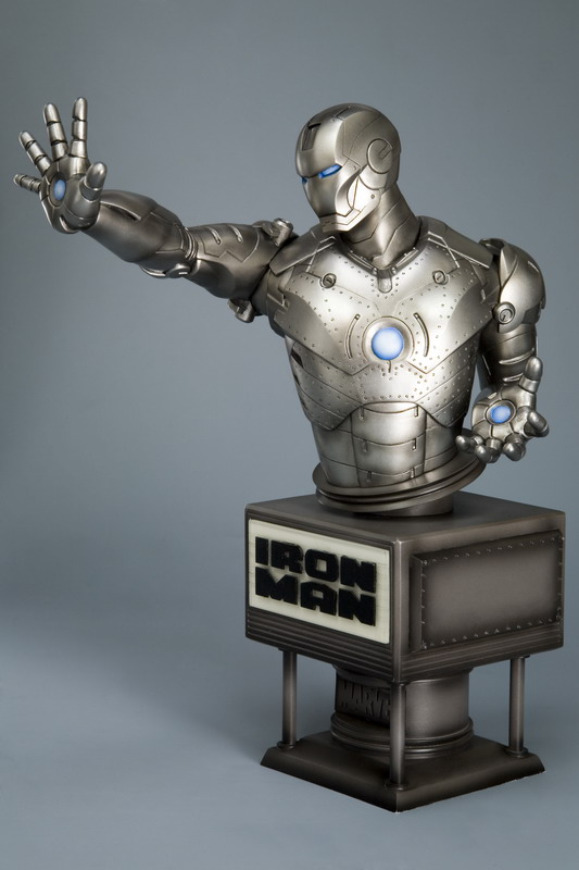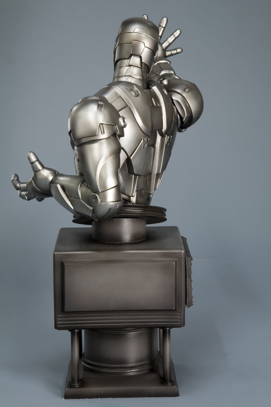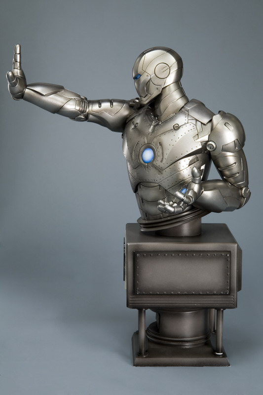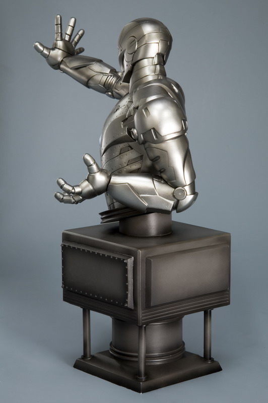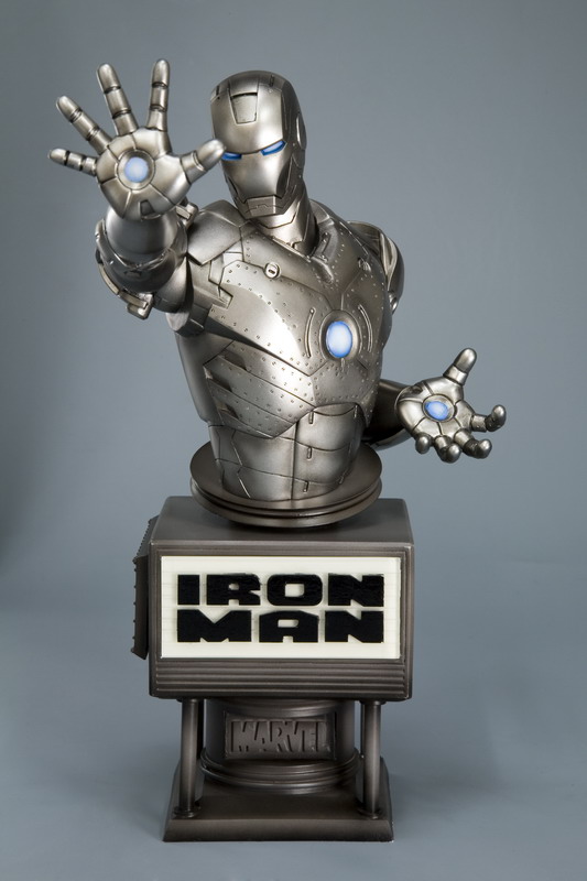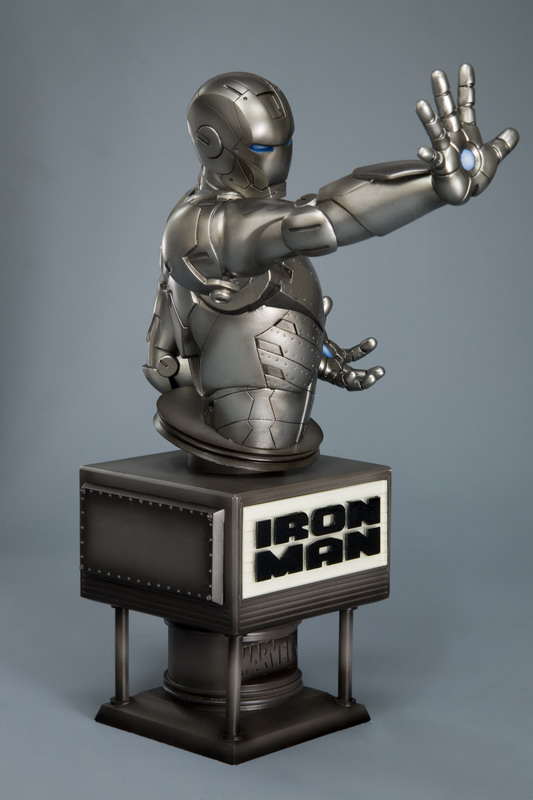 The Iron Man Mark II stands approximately 9" tall (in 1/6 scale with all of the other Marvel Studios Fine Art Busts) and rests atop a deluxe base with light up "Iron Man" logo movie marquee. A limited edition, the Mark II is individually numbered on an engraved metal plate.