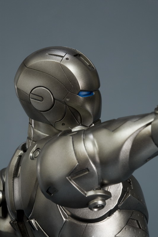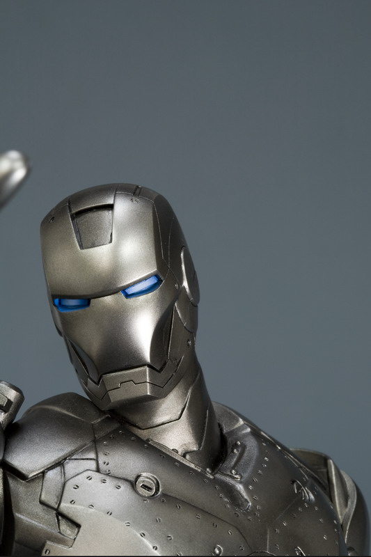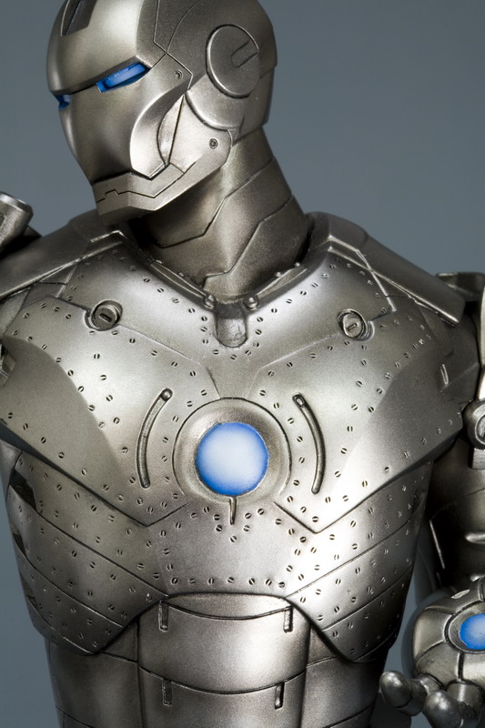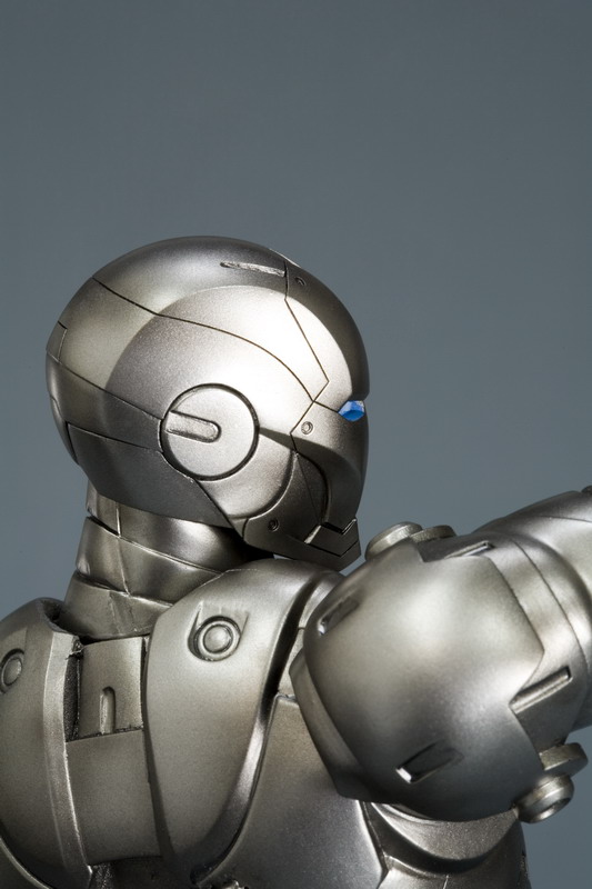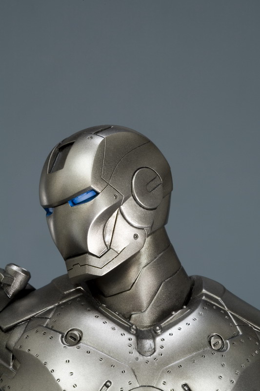 Iron Man is posed to do battle, with his right arm outstretched and Repulsor Ray at the ready. The gleaming metal armored suit is recreated with painstaking attention to detail, covered in individual plates, rivets, and screws. The Mark II suit's overall silver is broken up only by the bright blue of its eye holes, Repulsor generators, and chest plate. Best of all, Iron Man's right palm Repulsor Ray is illuminated via an LED light.