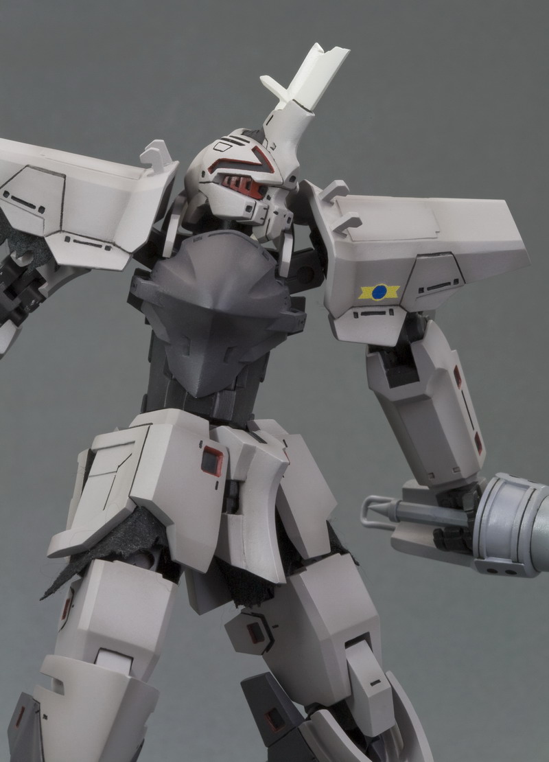 With an interior core robot "Cross Frame," this fighting unit has universal attachment points which connect to multiple armor and weapon parts. All of the Frame Arms robots share interchangeable parts, and can also connect to and use the M.S.G. (Modeling Support Goods) series of support units for unparalleled customization. The Delphine resembles a robotic knight complete with heavy armor and tall "plumed" helmet. The frame features approximately 30 points of articulation, even with the added components. The Delphine comes ready for battle with its Prototype Heavy Grand Sword and Heavy Lance Type 4. Standing at approximately 6 ½ inches tall, the robot is comprised of approximately 300 parts.