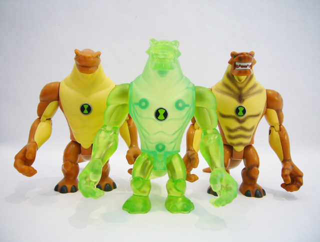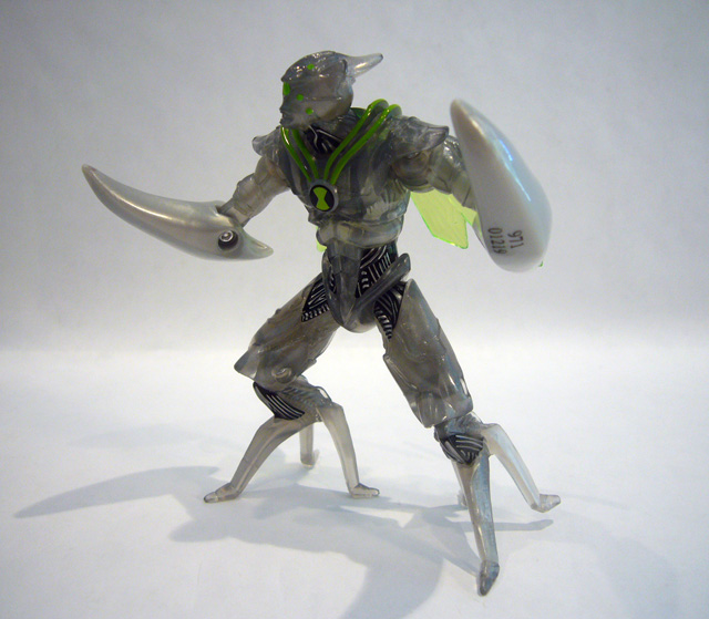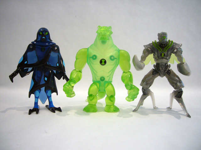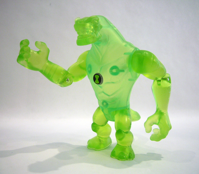 As with all translucent figures, this one loses a lot of sculpt definition when there's no paint to bring it out, but that's the tradeoff. On the plus side, the bright green looks cool, especially next to the previous incarnations. The chest-mounted Omnitrix is painted in black and green.