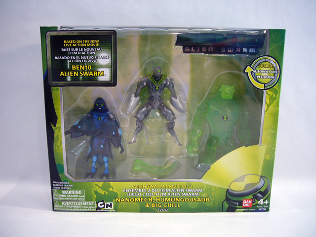 Viewers of Cartoon Network will no doubt be familiar with the Ben 10 franchise. It's a great cartoon that's morphed from the original series into Ben 10: Alien Force and now the upcoming Ben 10: Ultimate Alien. What you may not know is that there have also been two live-action Ben 10 films on Cartoon Network. Both of them mixing live actors and CG creatures, the films gave us new looks at our favorite aliens and some villains never before seen in the show. To celebrate and promote the second film, Ben 10 Alien Swarm, Bandai released two Movie Sets, each with three figures in the Alien Collection series. Today we'll take a look at the second set containing Nanomech, Humungousaur, and Big Chill!