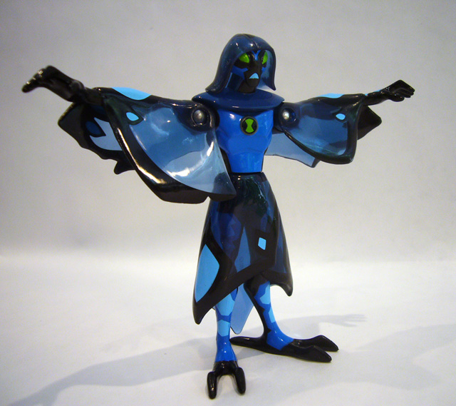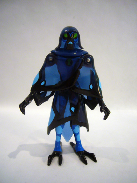 Big Chill is one of my favorite aliens in Ben 10, and so I was very excited to see another version of him in this set. The previous release captured the Necrofriggian in "flight mode" with his four wings extended. This time, Big Chill appears in his hooded and cloaked form with the wings wrapped around him. You can tell that this look was a bit of a challenge for Bandai to recreate in this scale, and the figure succeeds in some ways better than others. In his resting position, the figure looks very good and captures the character quite well. Big Chill's sculpt is nice with smooth wing surfaces and differing thicknesses where they overlap, and patterned alien skin on the head, hands, and legs. The wing sections, which on this figure form the cloak, hood, and skirt, are made of clear blue plastic.