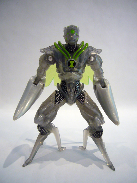 Like the previous Nanomech figure, V.2 is primarily gray, though this one is a much lighter hue. A lot of this is accomplished with translucent gray plastic parts, which look even better with painted details underneath. Other than the gray, circuitry is done in black and silver, and the shovels are slightly metallic gray. Green shows up on Nanomech's eyes, chest tubes, Omnitrix, and wings (translucent).