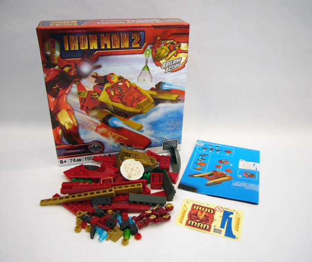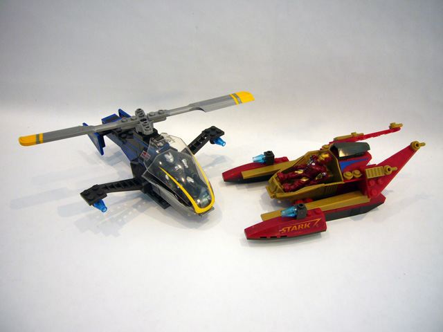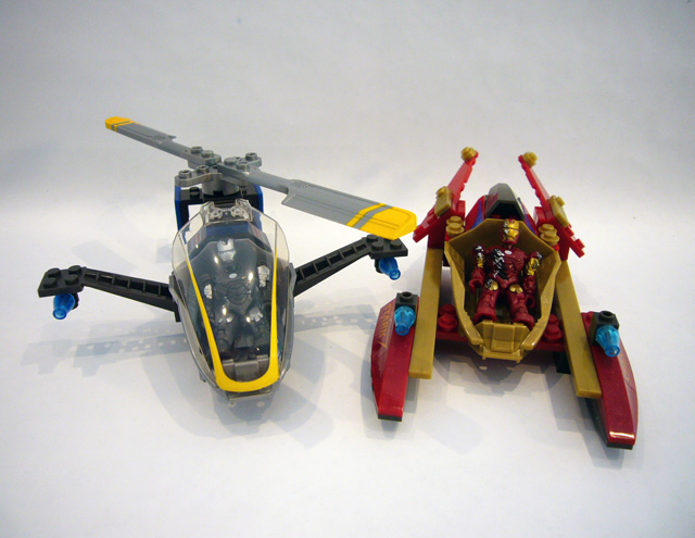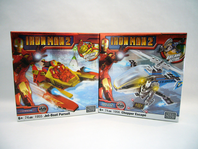 While Iron Man and War Machine pretty much just flew around under their own power in the Iron Man 2 film, these building kits provide young fans with fun "just off screen" vehicles. Iron Man rides the waves in a sleek jet-boat, while War Machine takes to the skies in his favorite chopper. Both vehicles are designed around a single-seater cockpit, and feature the same color schemes as their respective riders.