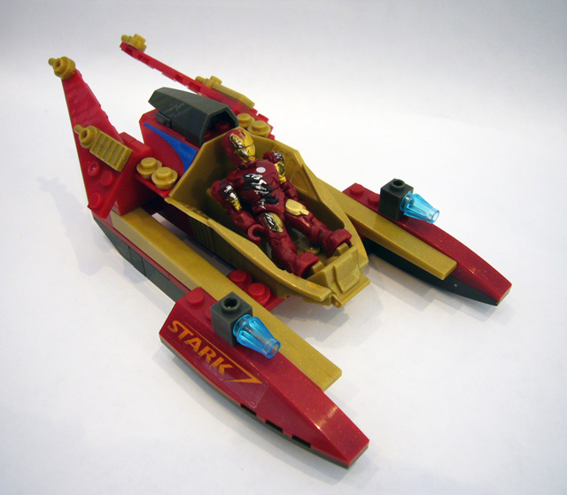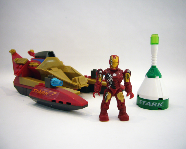 The jet-boat has a centrally-mounted pilot’s seat, with two forward pointing skis, a large engine block, and two rear-facing "wings." Low and wide, the craft looks built for speed. Most of the parts are dark red and gold, with accents in black and blue. Stickers applied to the skis mark the boat as belonging to Stark Enterprises. The accessory in this set is a green and white buoy that's actually pretty cool, with a clear green top and another Stark sticker.