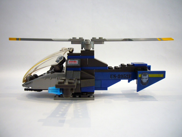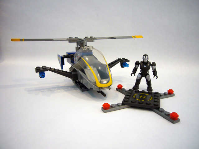 War Machine's "chopper" matches its rider not just in color, but also in demeanor. Behind and above the bulky cockpit spins a twin-bladed rotor, while pylons extend to either side. The helicopter rests on two skids, and the long body of the craft terminates at two panels designed for stickers of War Machine's armored head. The chopper is primarily black, blue, and gray, with lots of yellow details. There are clear blue protrusions at the ends of the pylons (guns?), and War Machine’s own gatling cannon can be mounted below the cockpit. The accessory in this set is a small helicopter landing pad.