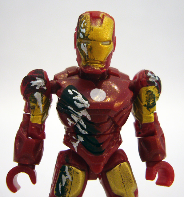 The figures complete the look of their film counterparts with detailed paint jobs. War Machine is the simpler of the two, but still looks great in black and silver. The black even has a subtle sprinkling of bright flecks. Iron Man is bright red and gold with white details, but that’s just the start. This version has seen plenty of action, leaving severe battle damage on both arms and the right side of his body from his head to his knee. The scraped look is very striking, especially on the helmet’s face.