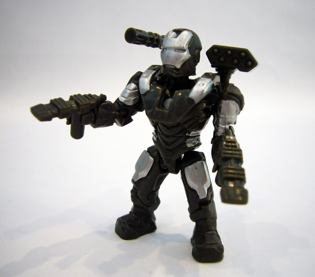 While Iron Man has the more interesting look, he doesn't have any accessories of his own. War Machine on the other hand has a shoulder rig that plugs into the hole in its back. The included gatling cannon and missile launcher pod then plug into the top of the rig. For even more firepower War Machine has two identical handheld weapons!