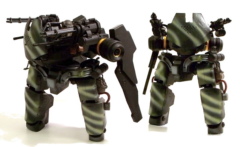 DRIO: I really like the look of the Hardballer, but I absolutely LOVE the Drio (the camoed GTF-11 Drio being my favorite). I've always been a sucker for "chicken walkers;" from my deep admiration of Robotech's Mad Cat to Star Wars' unforgettable AT-ST. The approximately 5 1/2-inch tall Drio takes the classic mecha design and adds its own sense of style, with nubby feet, finned back thrusters and a rotating armored face shield. It's open cockpit layout gives the Drio a more mobile weapons platform vibe, like an anti-aircraft gun on legs. It may be weaker in this regard, but it's no less cooler looking.