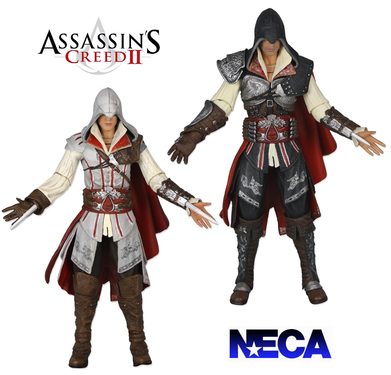 Unpainted prototypes of NECA's Assassin's Creed 2 action figures were on display at Comic-Con (pictured below), the stealthy video game character Ezio shown as two collectible versions: Classic White and Master Assassin Black. Pictured above are newly released images showing the figures in all their painted glory.