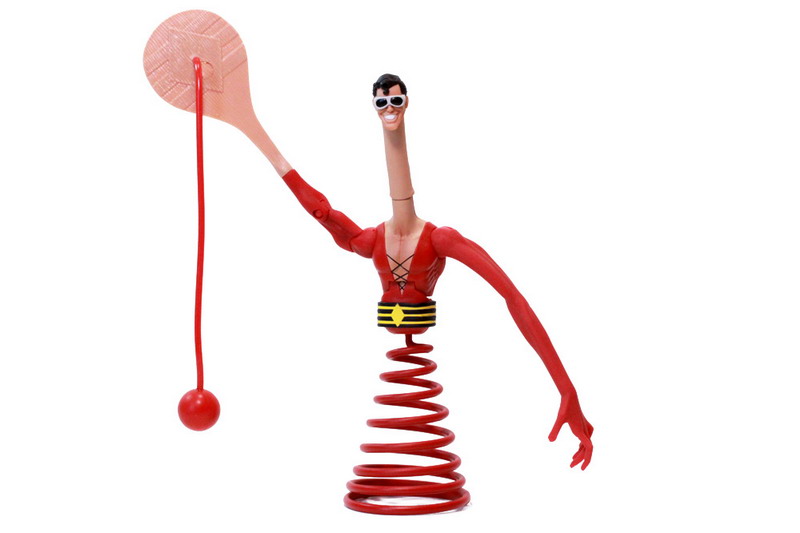 Plastic Man's hands are removable and set as fists. The accessories included can easily be swapped in and out in a variety of combinations. The rubber ball and paddle, as well as a fly swatter, are replacements for hands and there's also completely rubber arms that can be swapped in as well. A button on the back of Plastic Man eases the swapping out of the arms, a good feature to have.